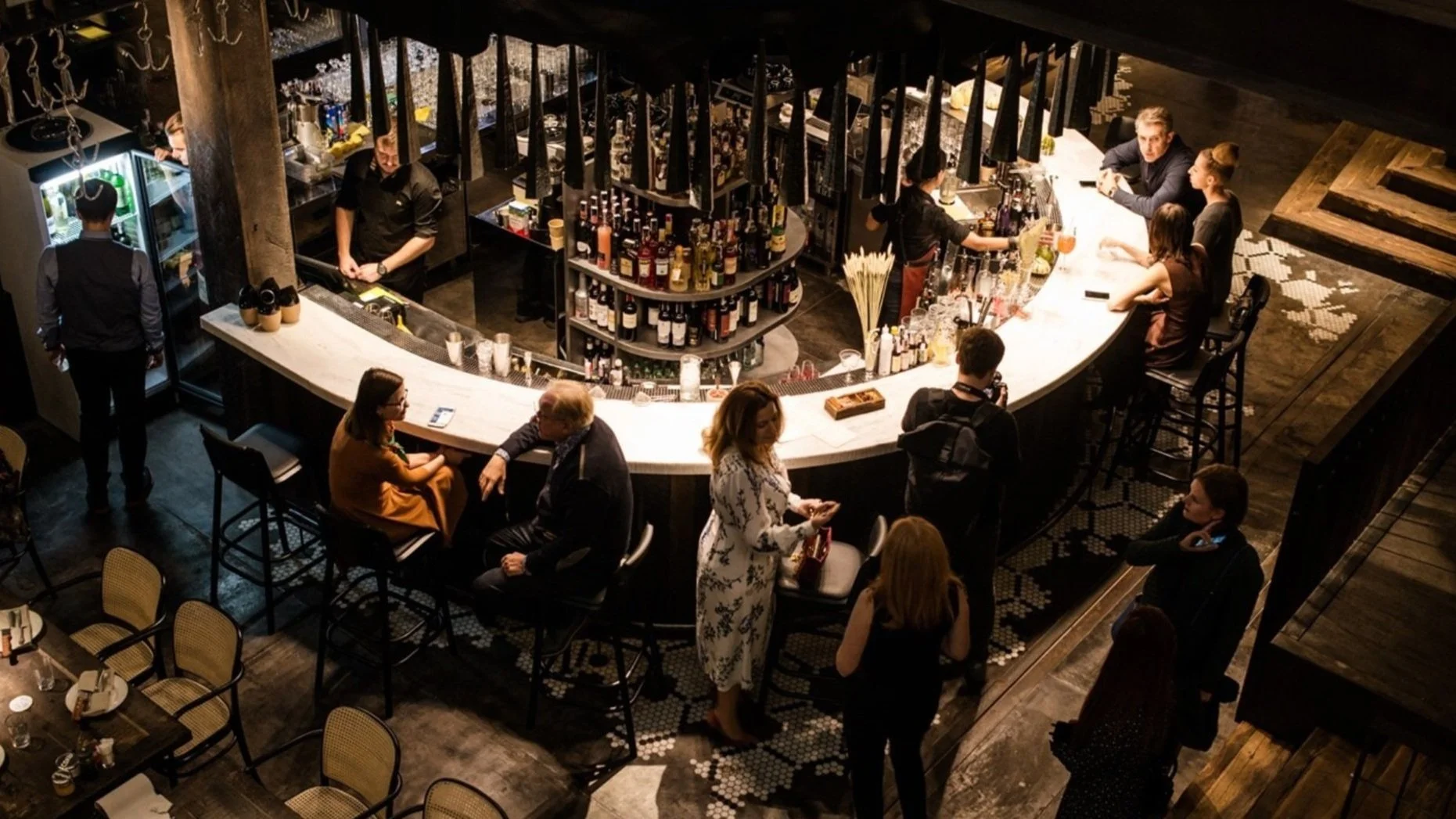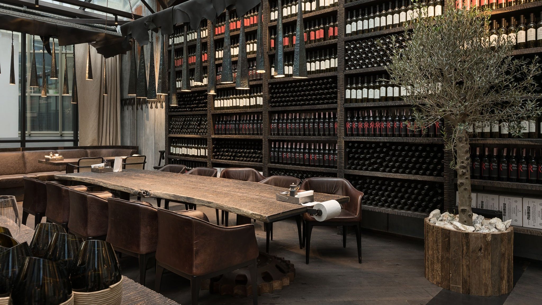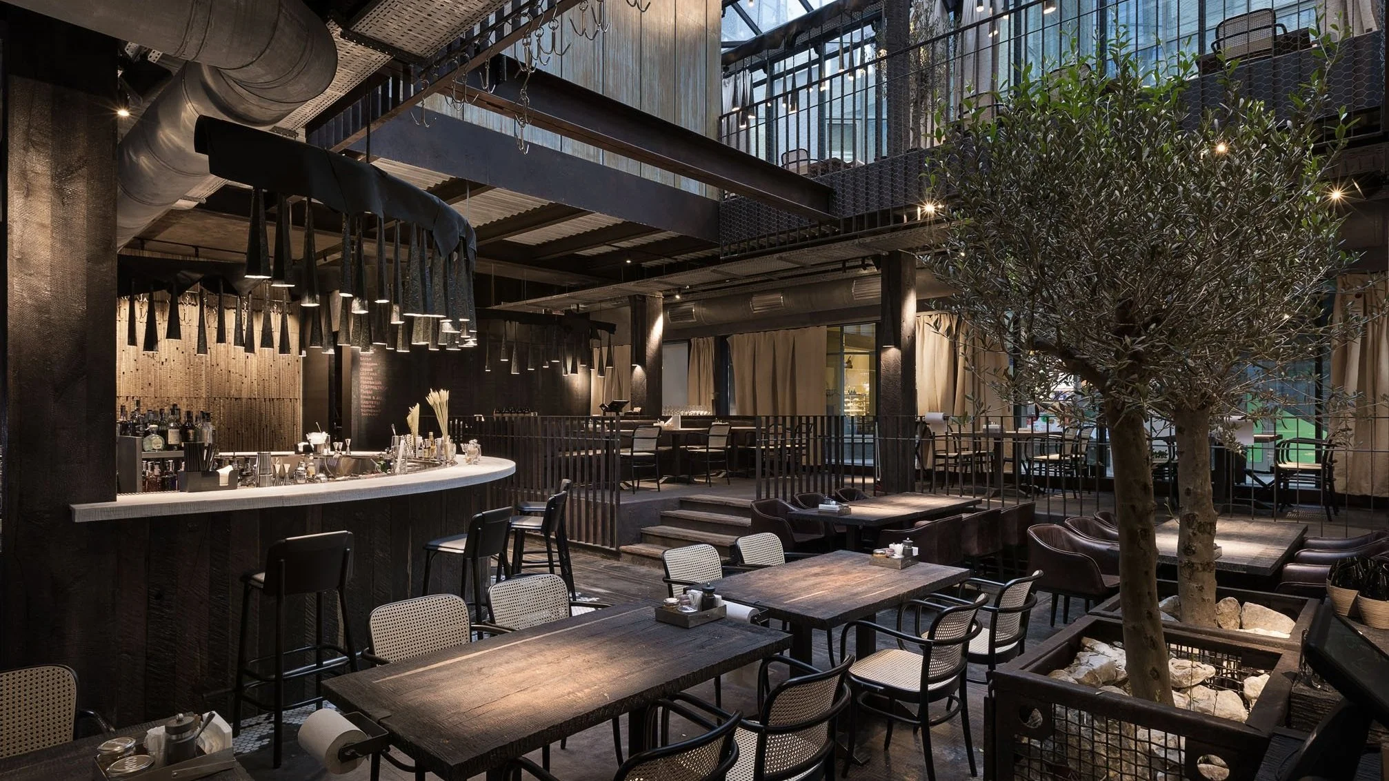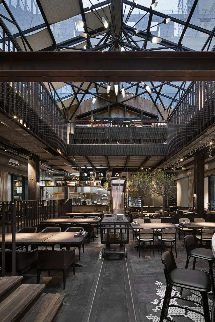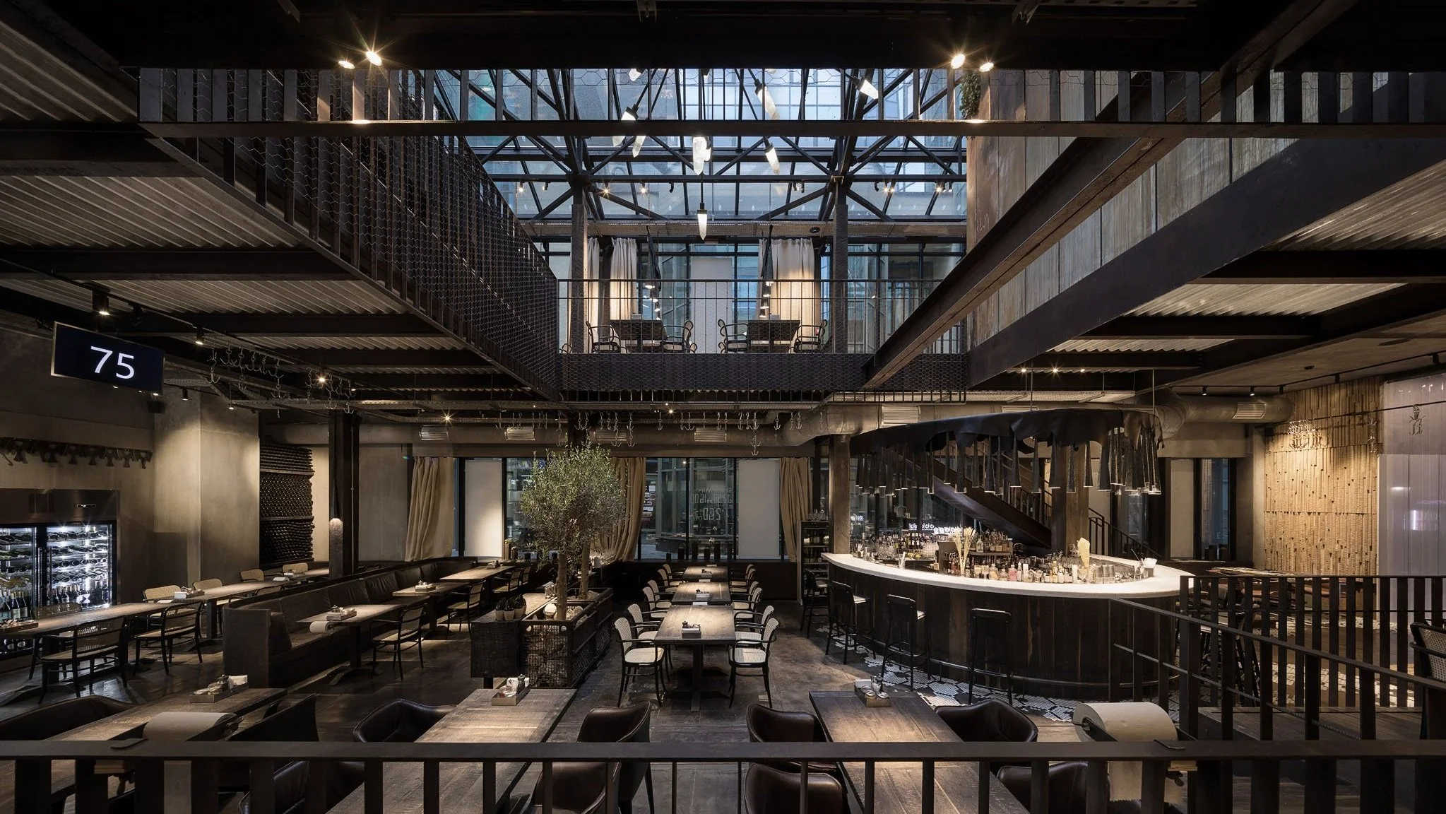 Interior design project by Belenko Design Studio (2019). Fine dining steakhouse, Kyiv, Ukraine. Services: concept, interior design, architecture. Design features: geometric glass ceiling, multi-level dining, wine tasting areas, professional open kitchen.