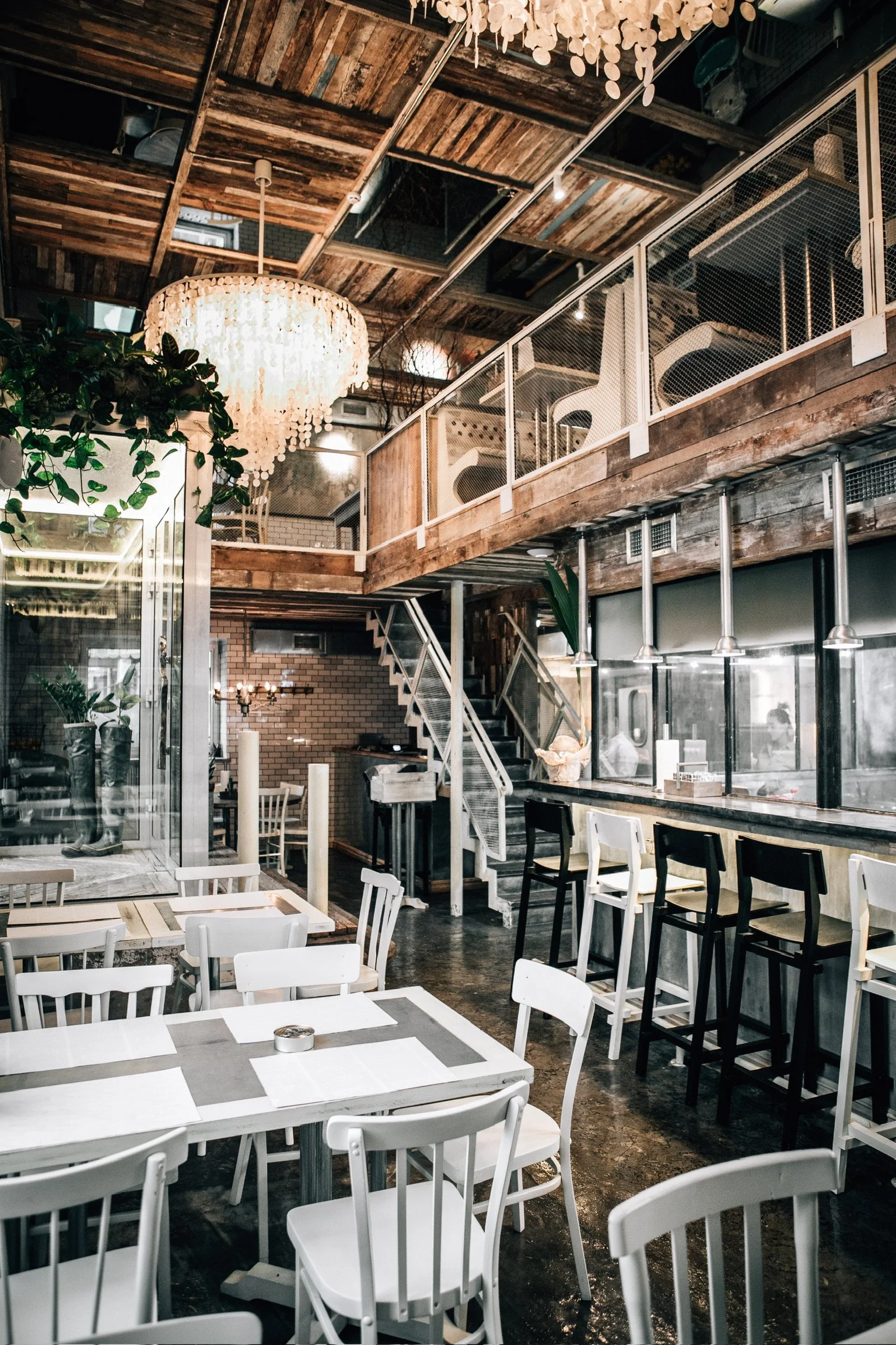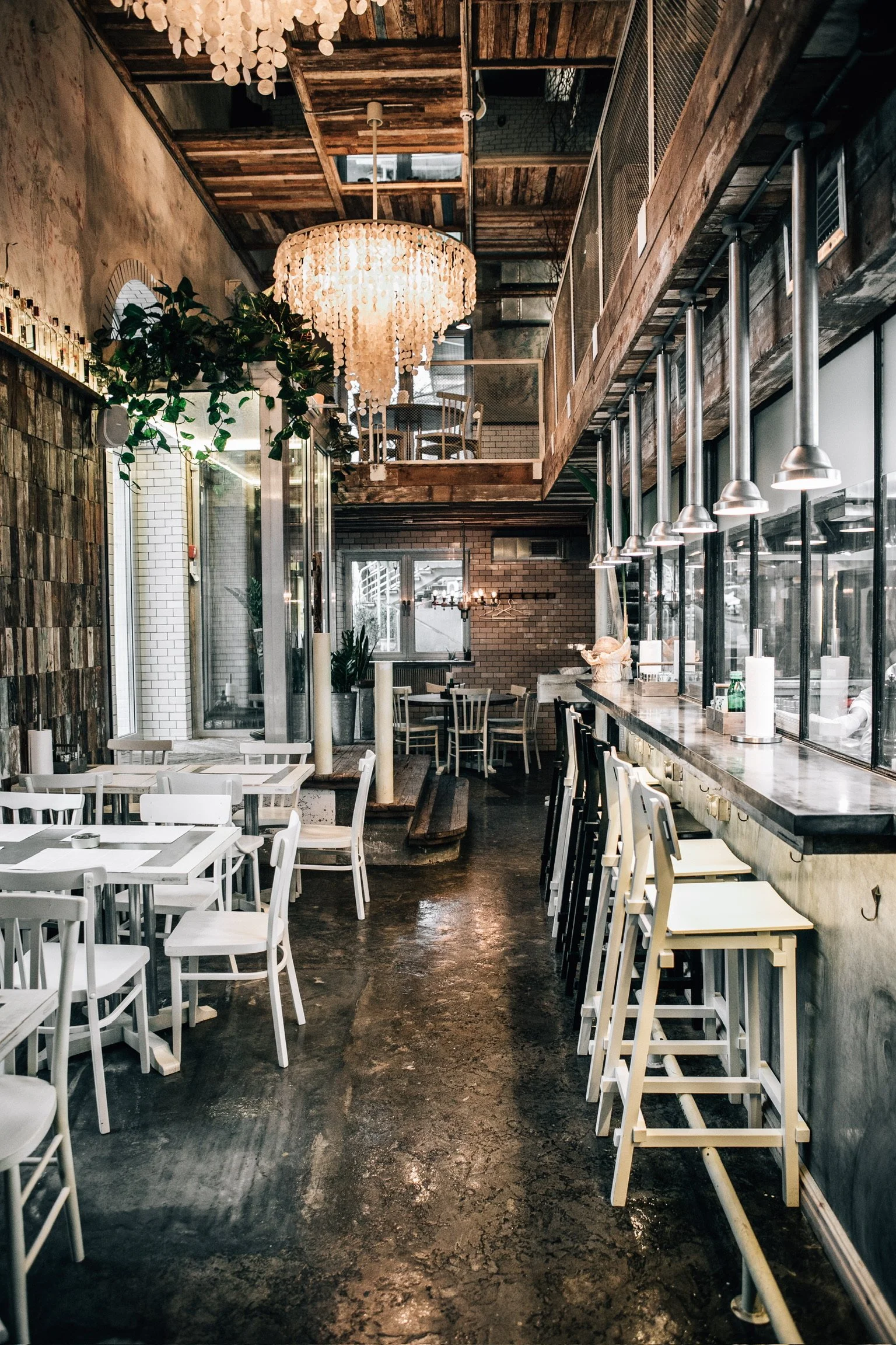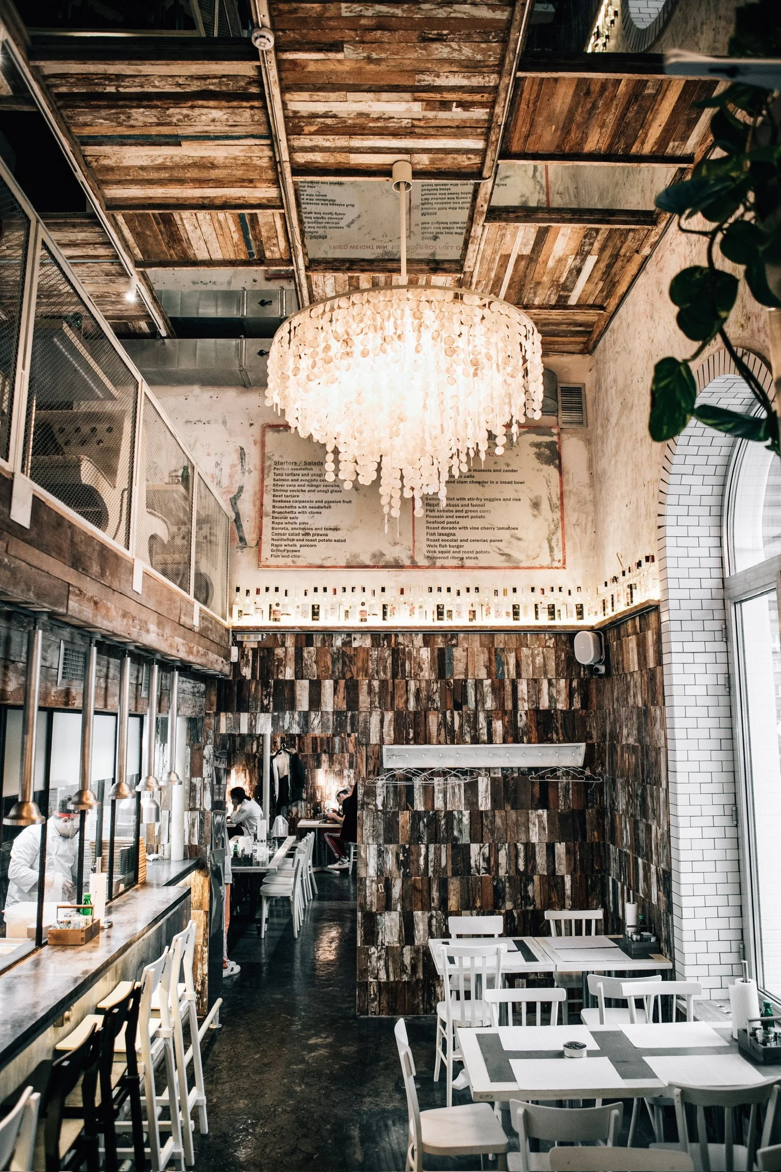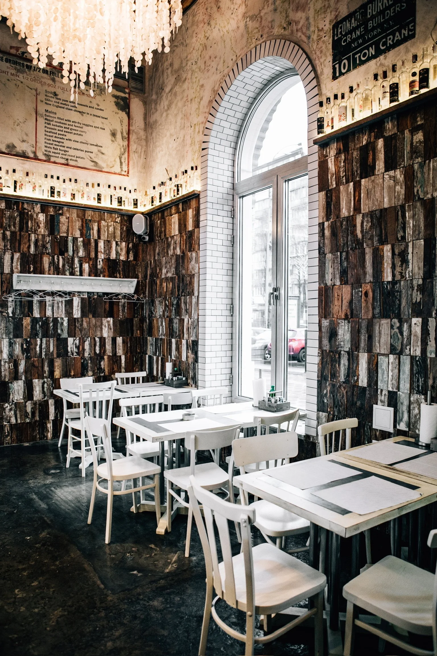 Interior design project by Belenko Design Studio (2018). Seafood restaurant, Kyiv, Ukraine. Services: concept, interior design, lighting design. Design features: custom chandeliers, rustic wooden ceilings, contemporary furnishings.