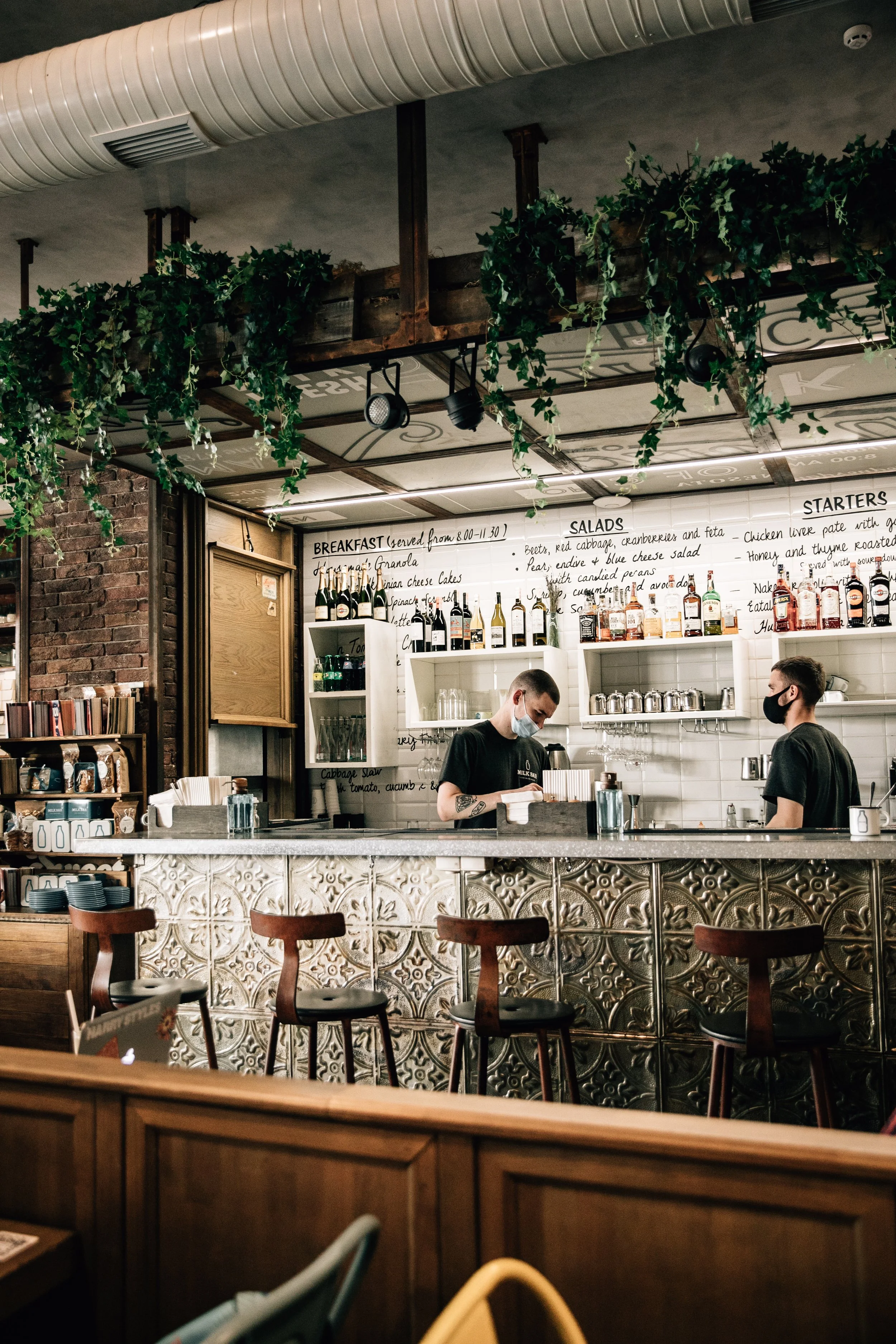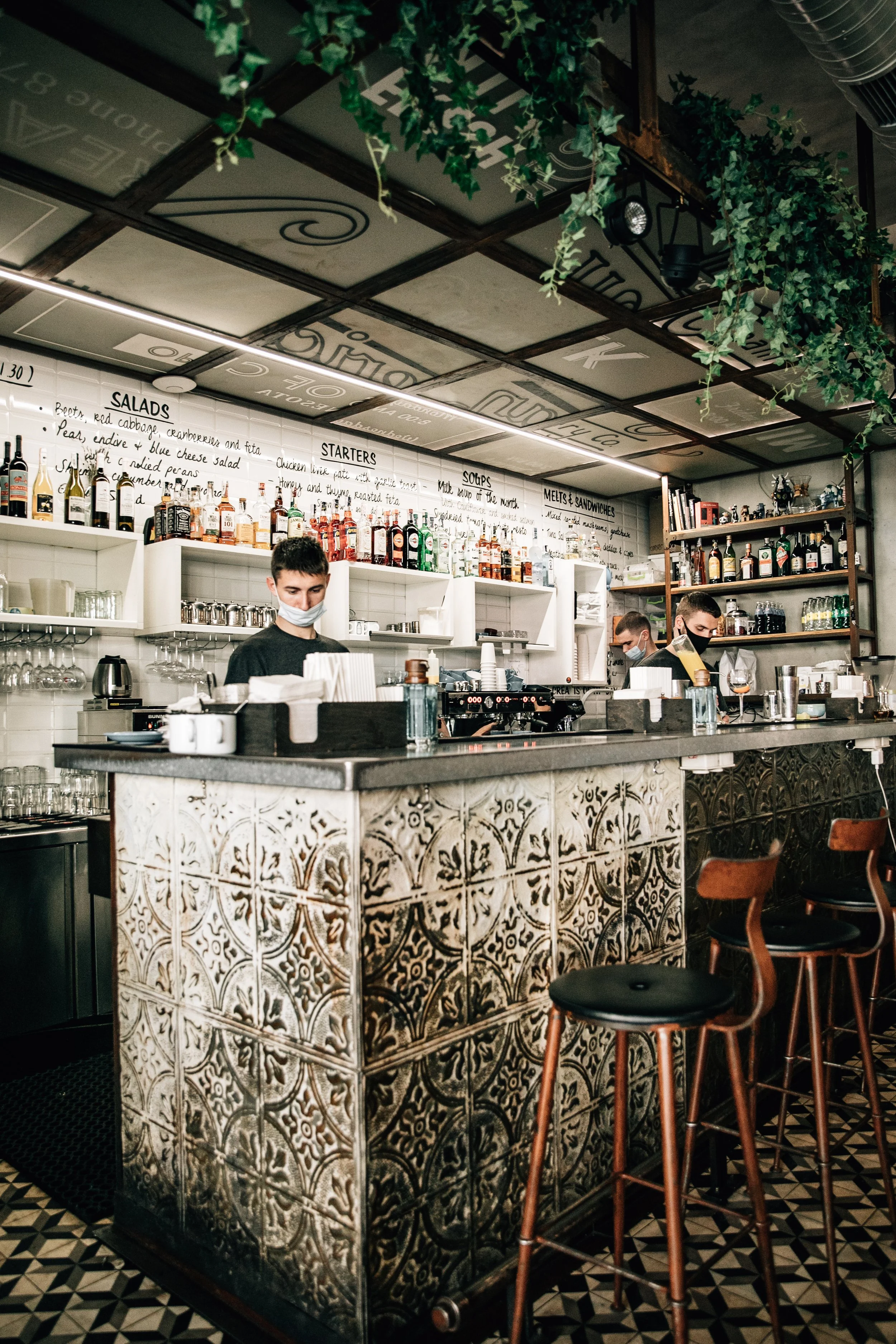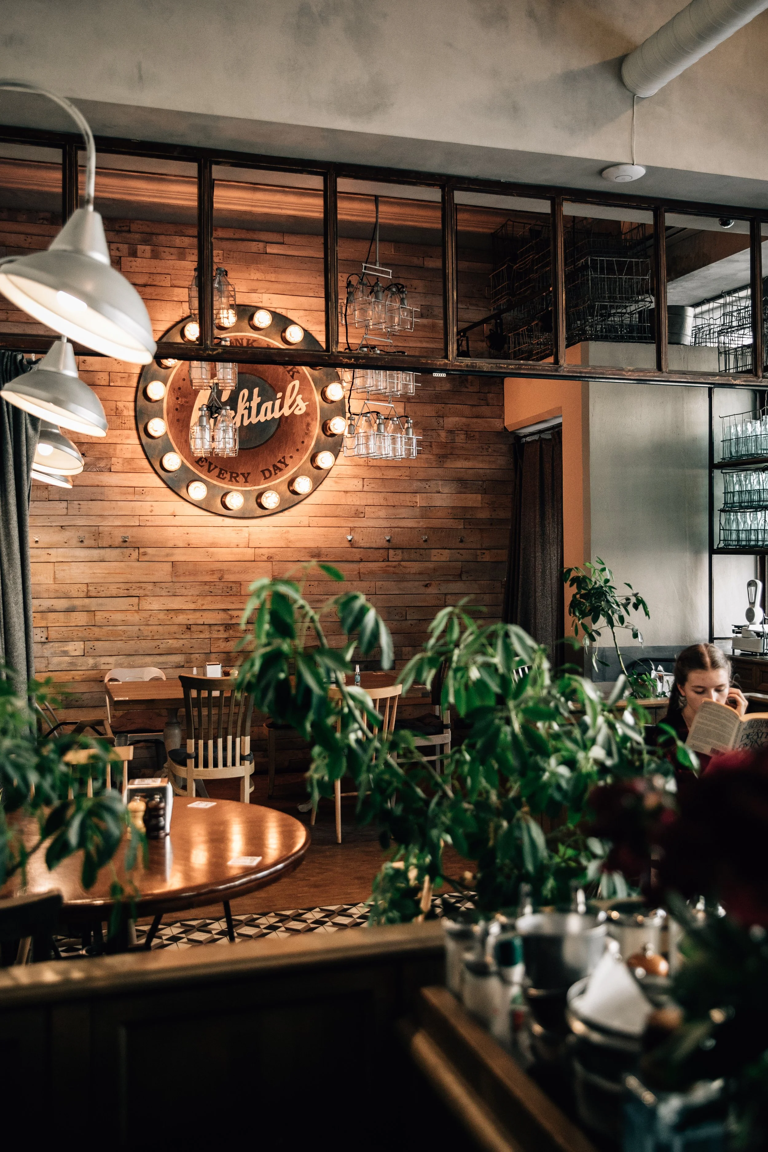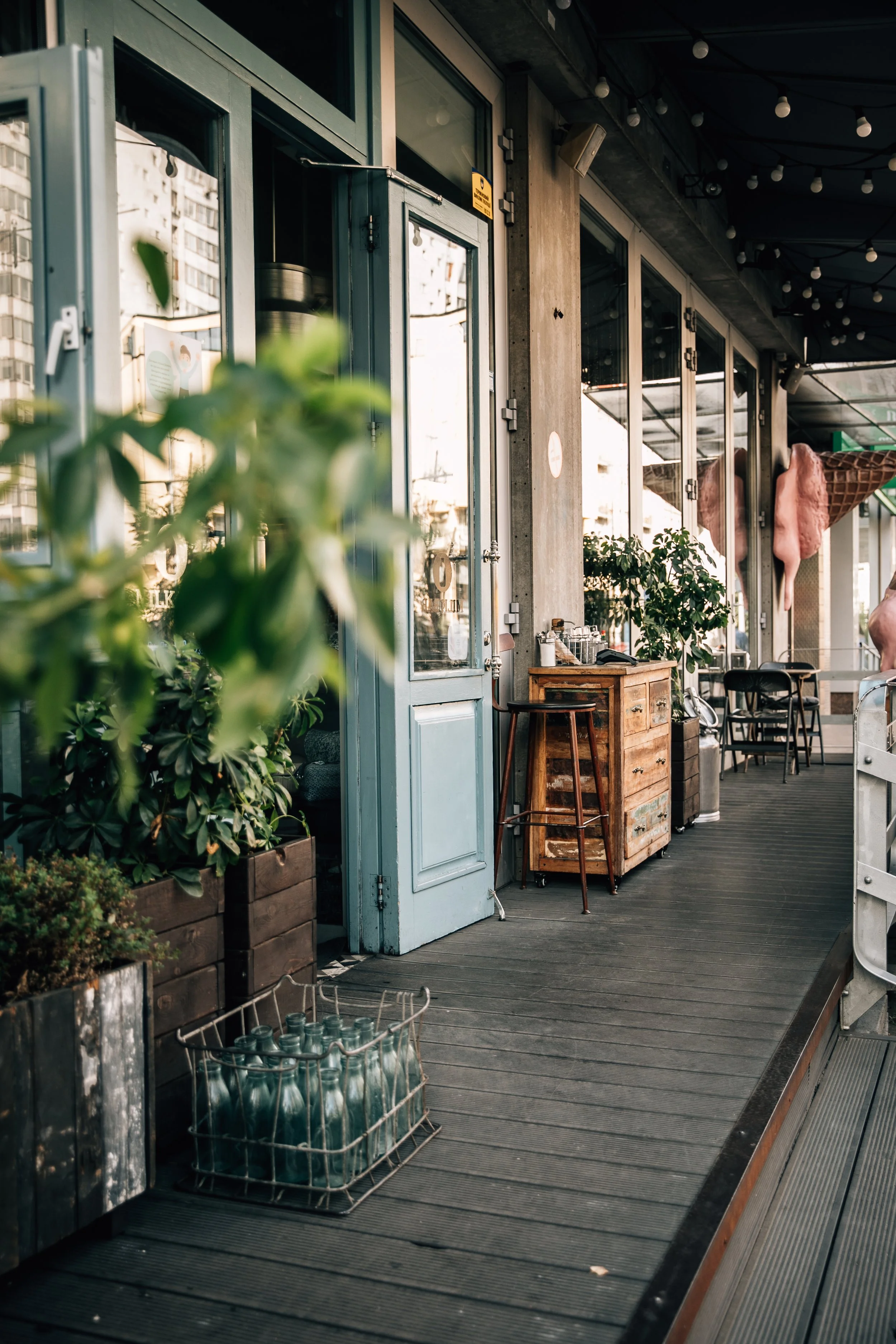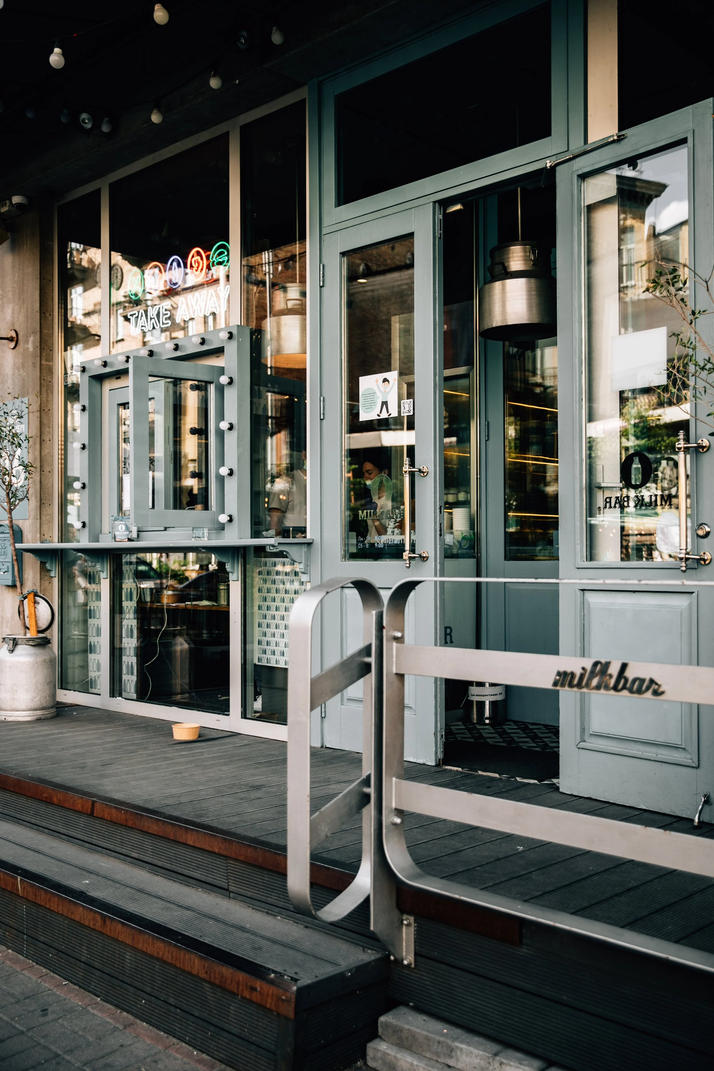 Interior design project by Belenko Design Studio (2014). Cafe and bar, Kyiv, Ukraine. Services: concept, interior design, branding. Design features: rustic-modern aesthetic, wooden elements, decorative signage, welcoming cafe atmosphere.
