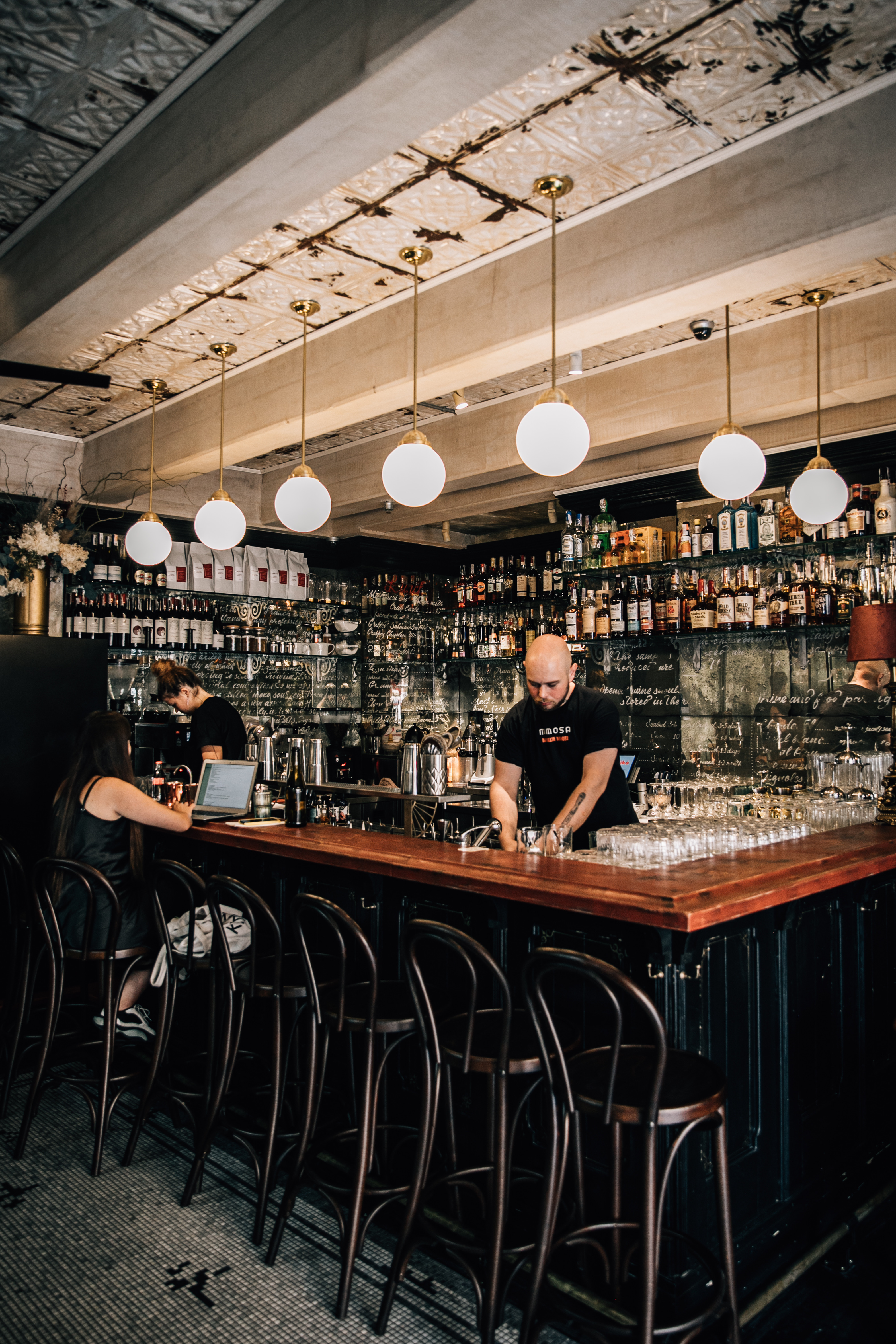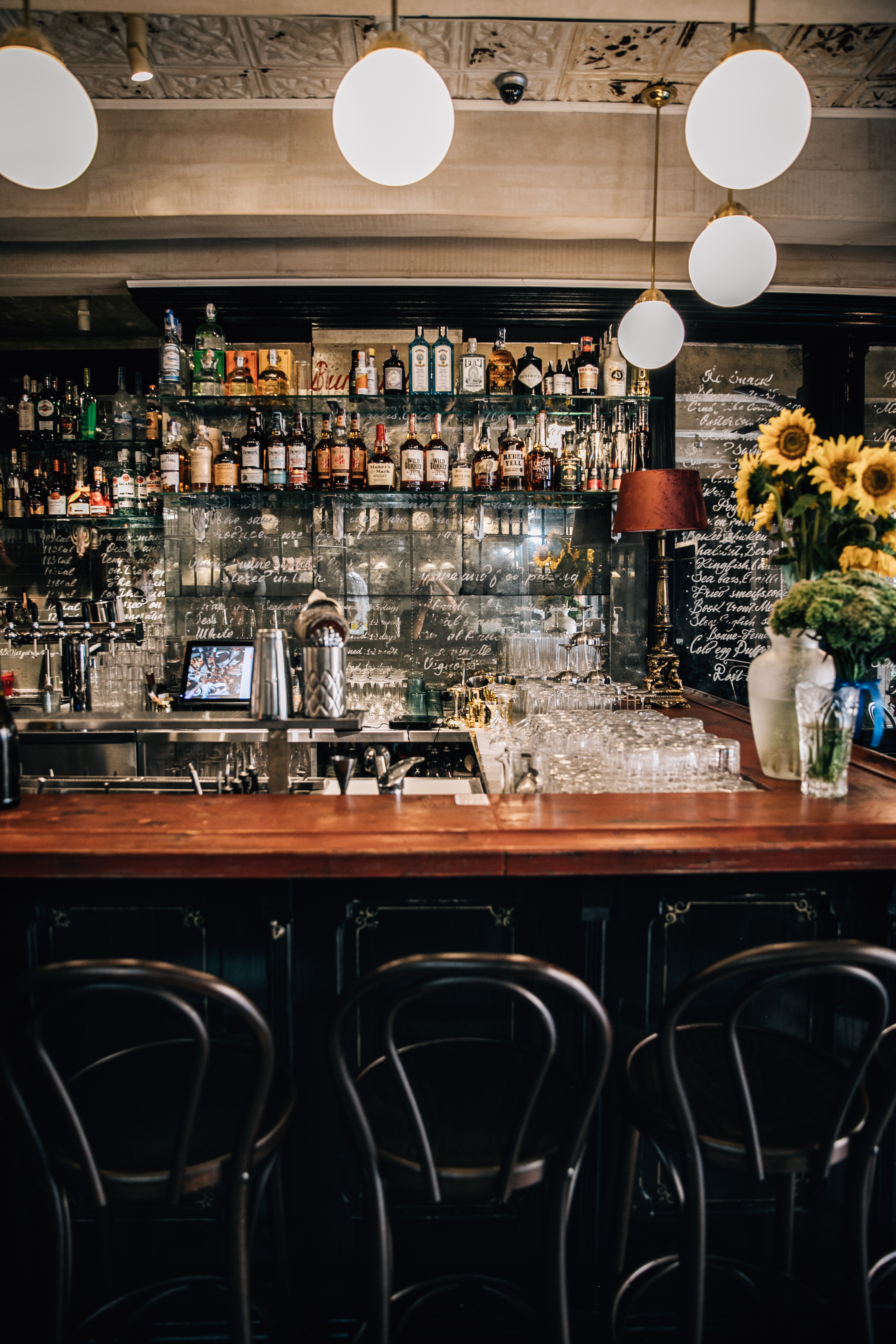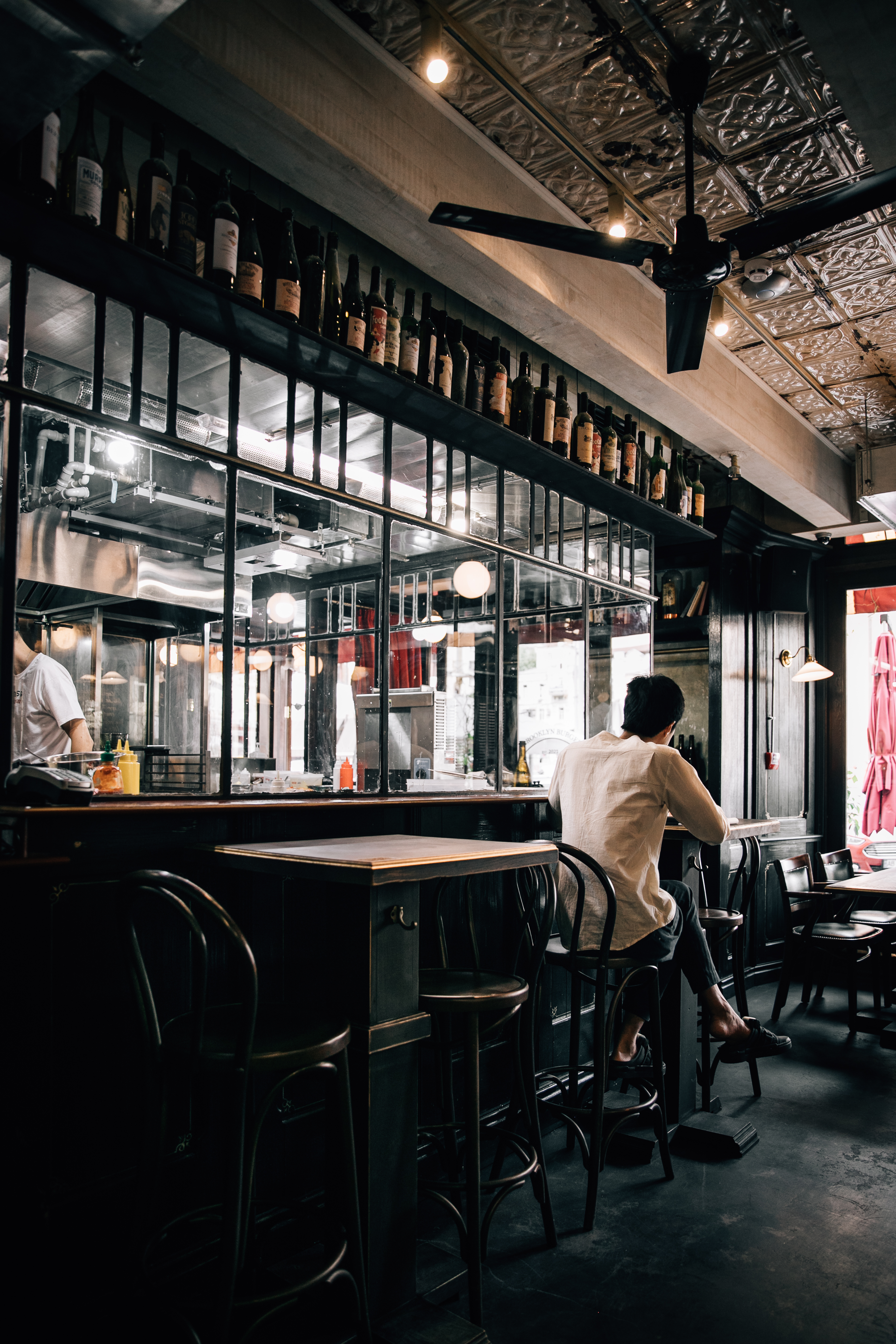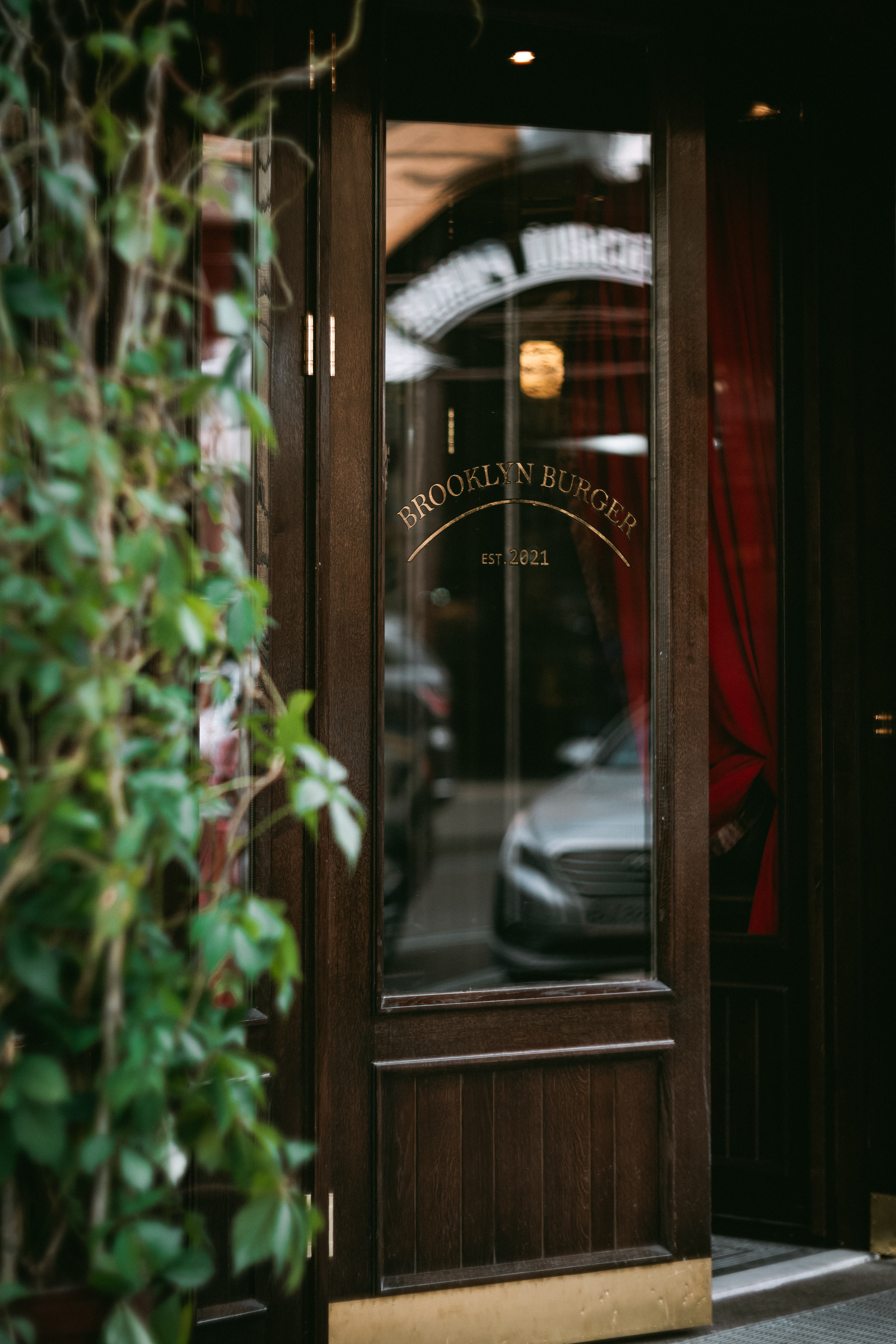 Interior design project by Belenko Design Studio (2019). Burger bar, Kyiv, Ukraine. Services: concept, interior design. Design features: vintage-inspired aesthetic, dark wood paneling, decorative lighting, curated furnishings.