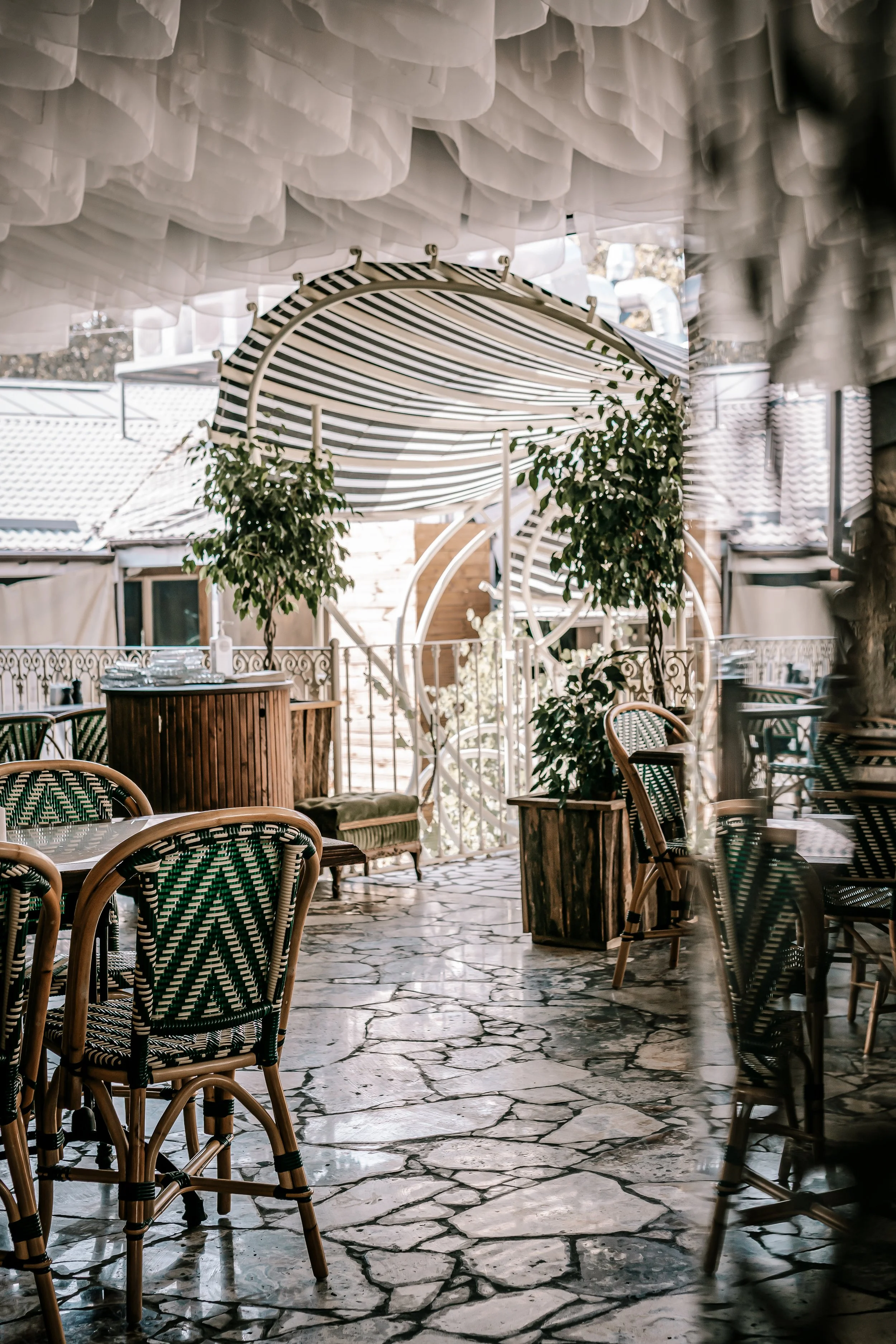 Interior design project by Belenko Design Studio (2021). Summer restaurant terrace, Odesa, Ukraine. Services: concept, interior design, exterior design. Open-air dining with Mediterranean-inspired elements and coastal atmosphere.