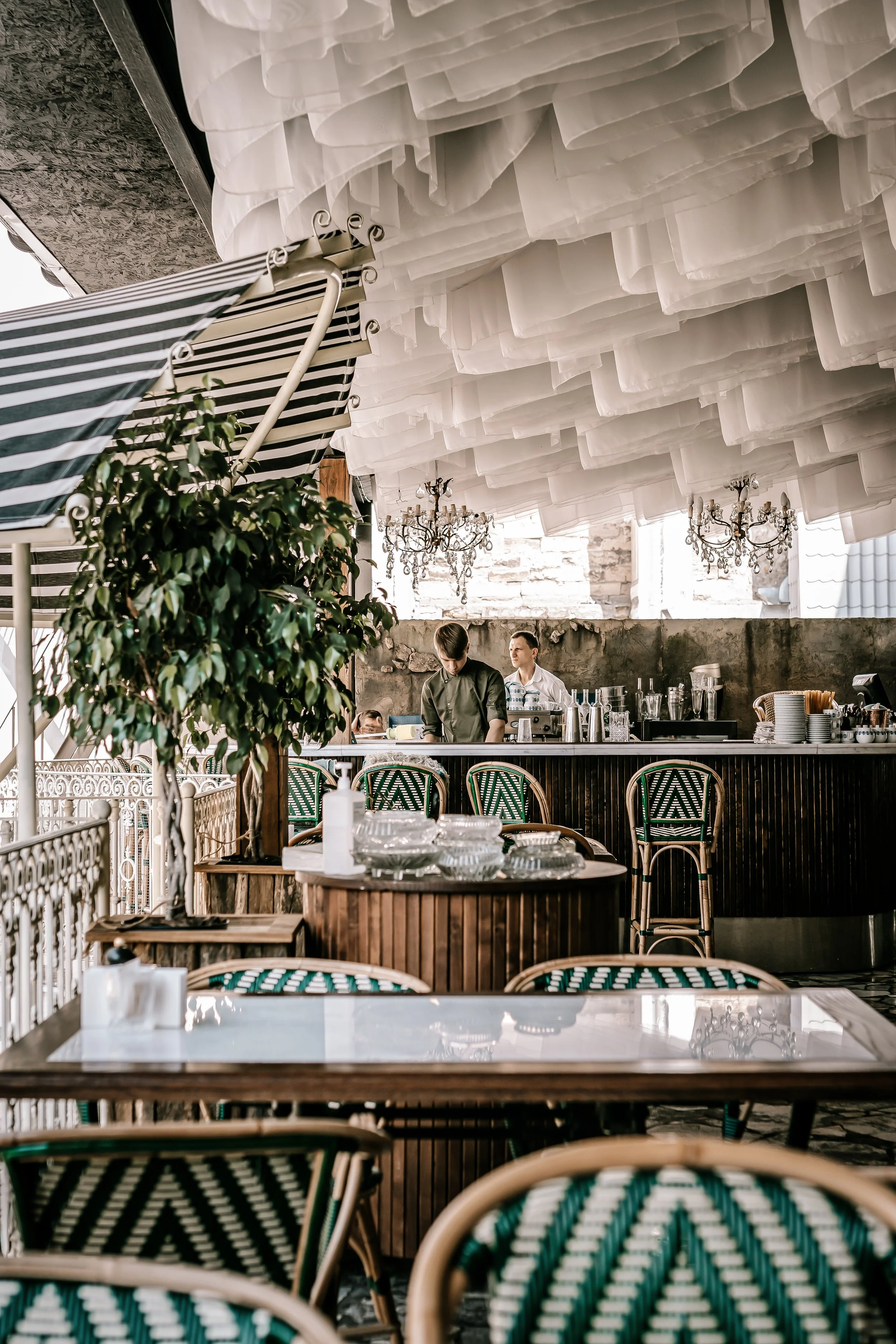 Interior design project by Belenko Design Studio (2021). Summer restaurant terrace, Odesa, Ukraine. Services: concept, interior design, exterior design. Open-air dining with Mediterranean-inspired elements and coastal atmosphere.