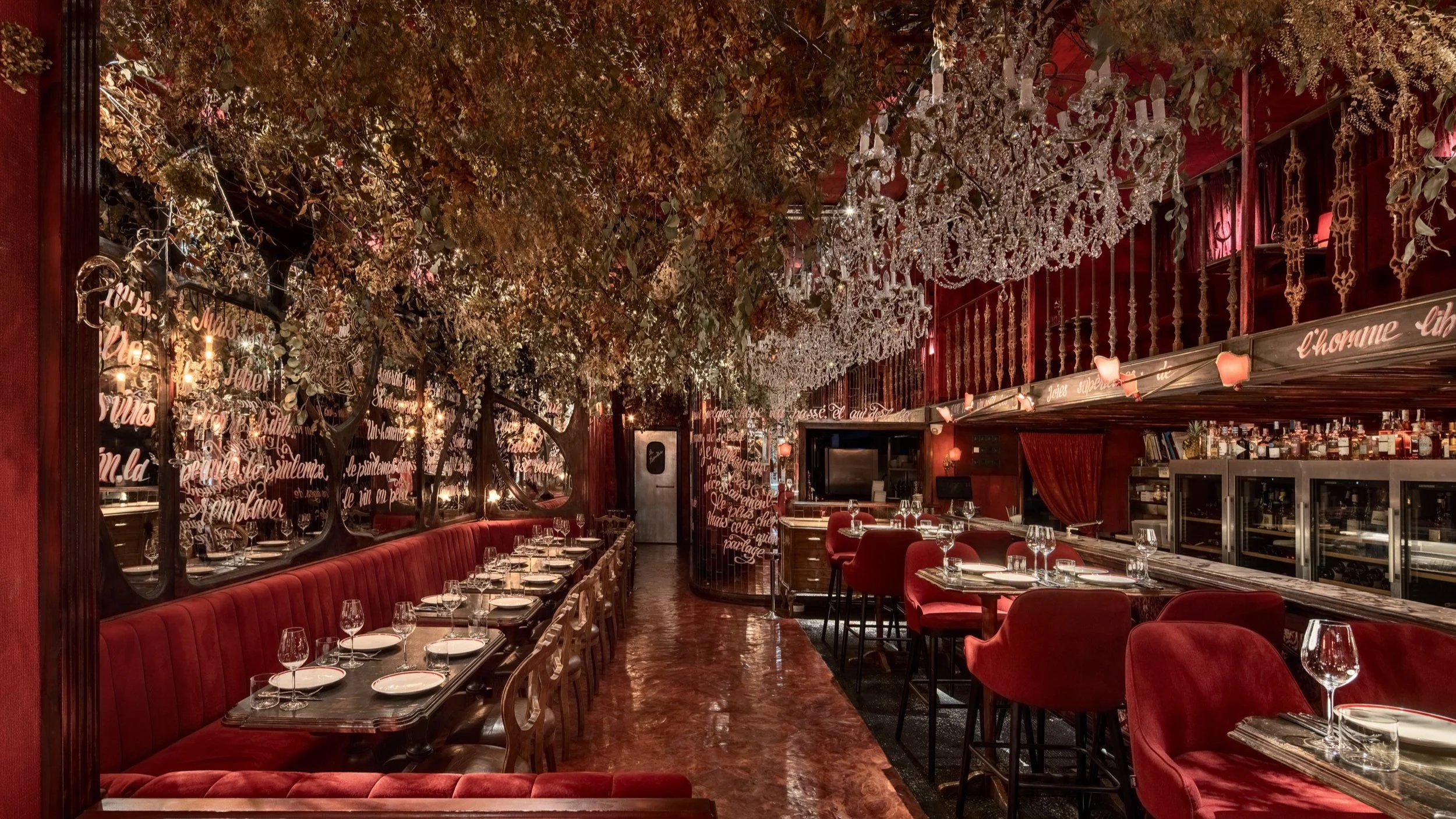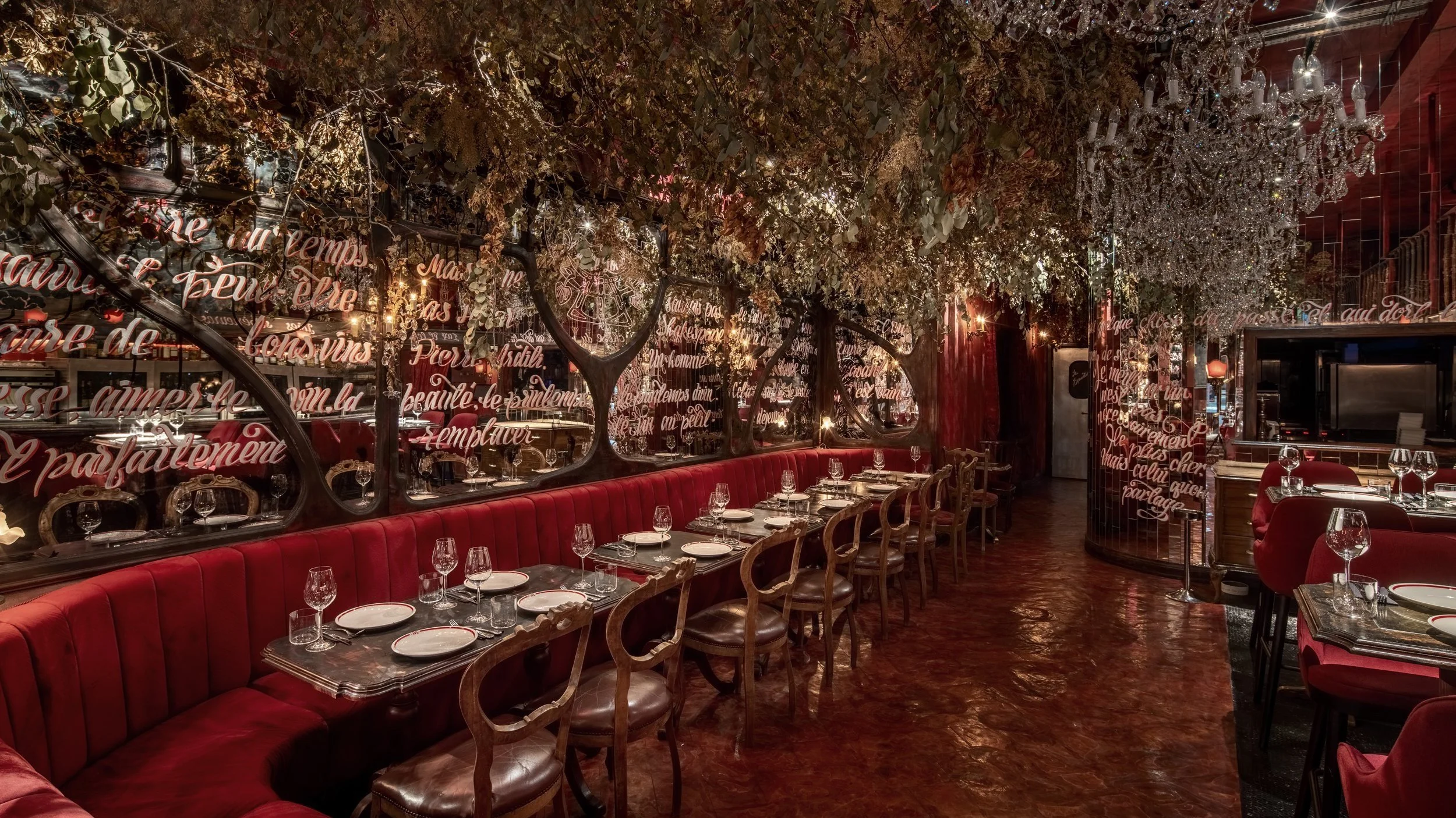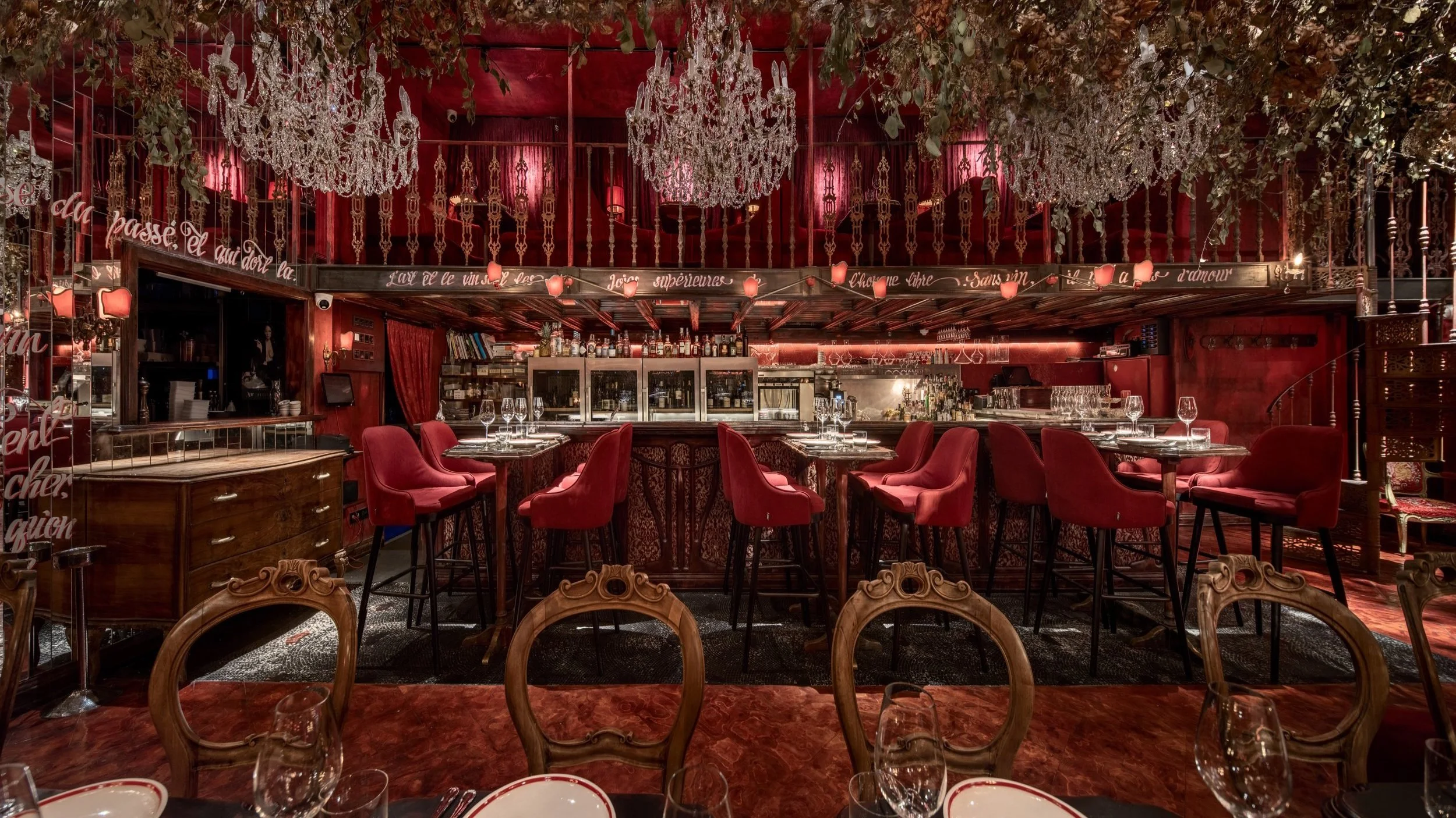 Interior design project by Belenko Design Studio (2019). Fine dining wine restaurant, Kyiv, Ukraine. Services: concept, interior design, branding. Design features: signature red velvet seating, ornate chandeliers, wine bar, sophisticated ambiance.