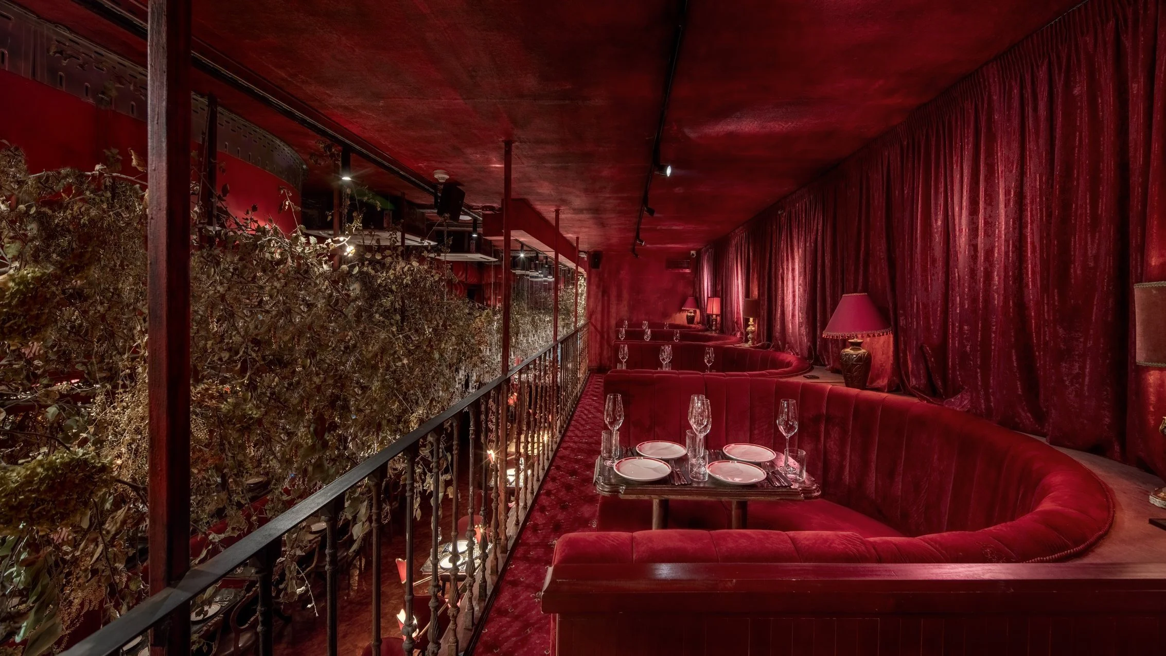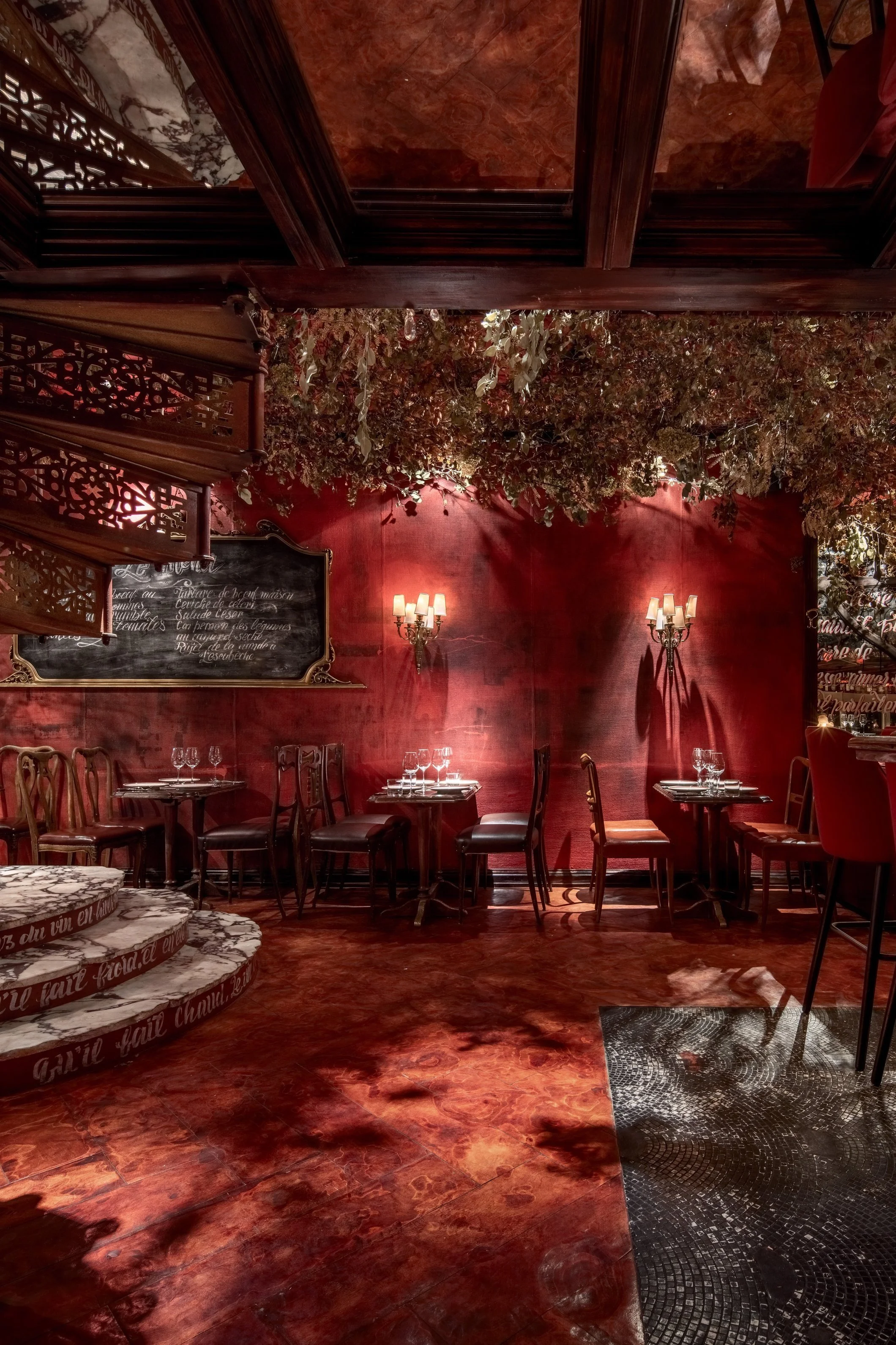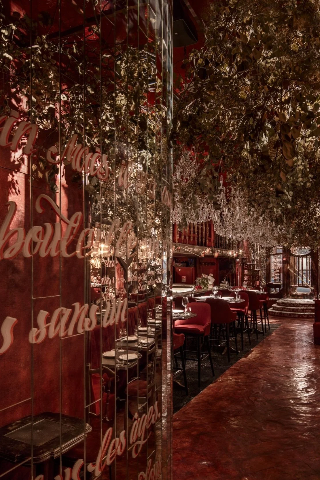 Interior design project by Belenko Design Studio (2019). Fine dining wine restaurant, Kyiv, Ukraine. Services: concept, interior design, branding. Design features: signature red velvet seating, ornate chandeliers, wine bar, sophisticated ambiance.