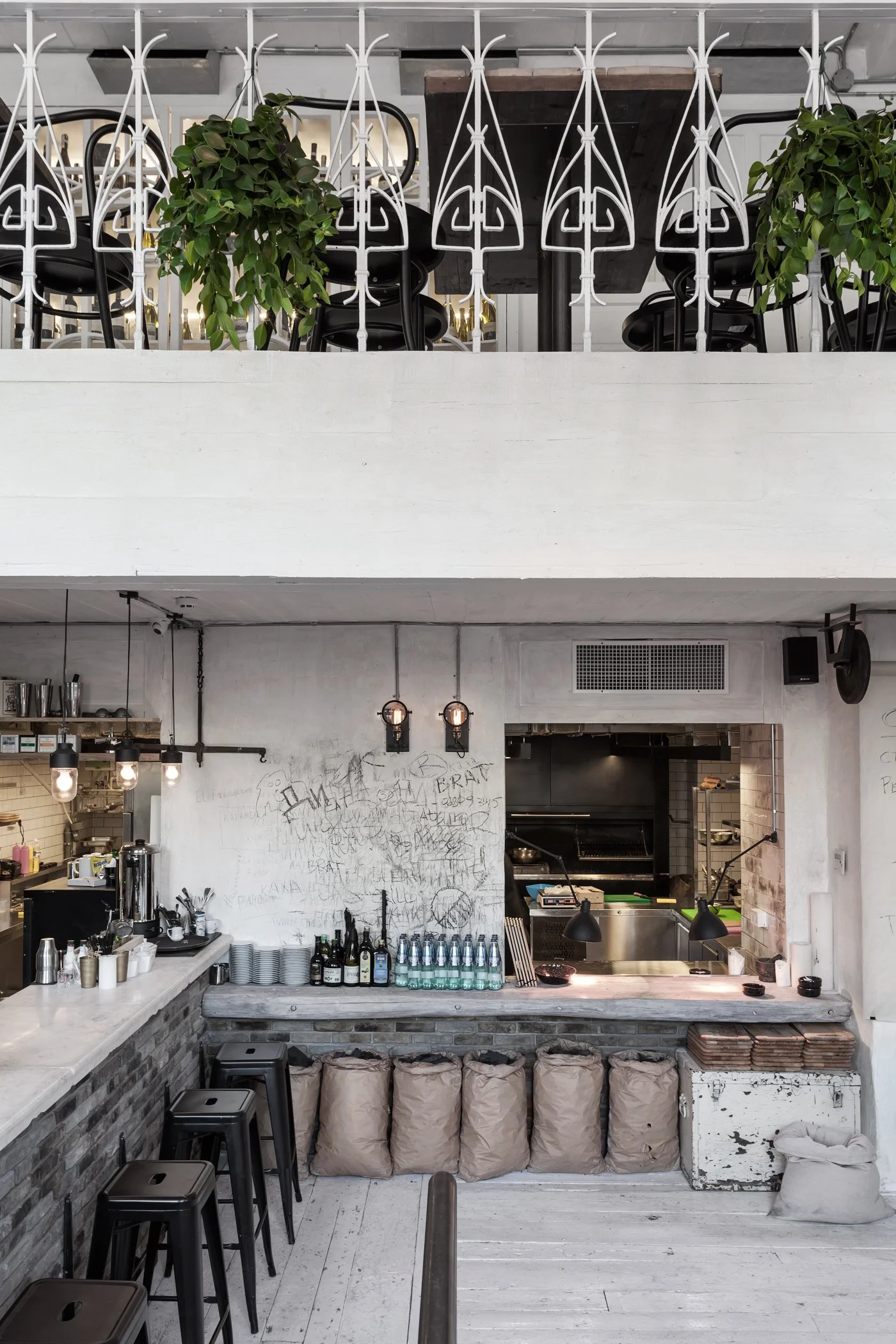 Interior design project by Belenko Design Studio (2016). Grill restaurant, Odesa, Ukraine. Services: concept, interior design. Multi-level dining with contemporary and rustic design elements, open grill kitchen.