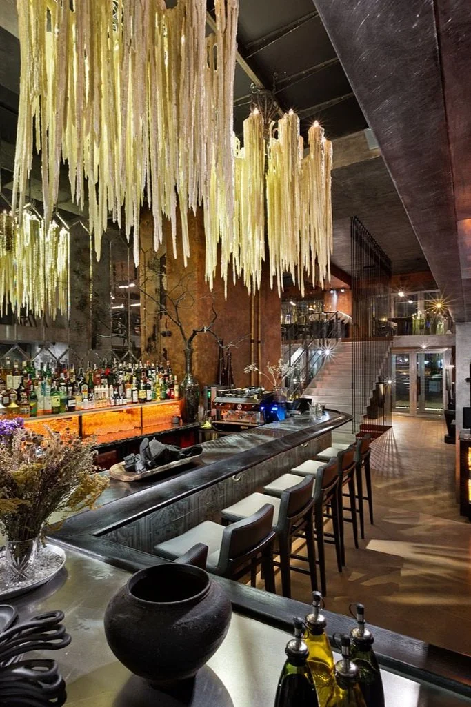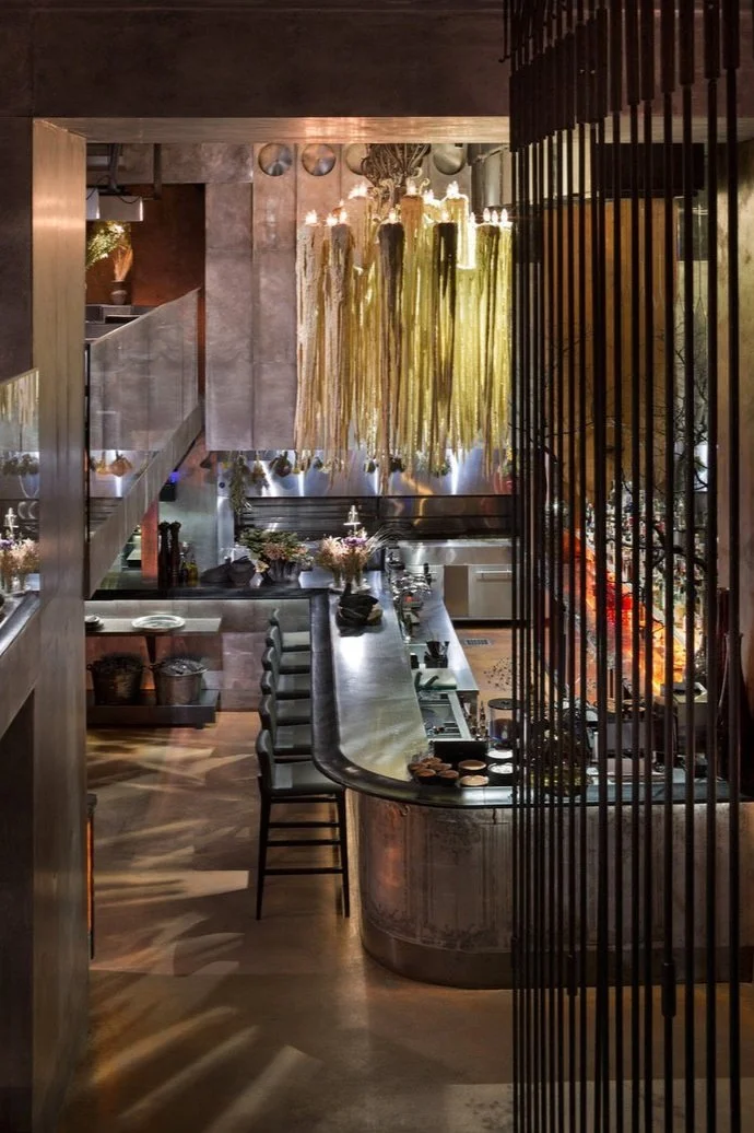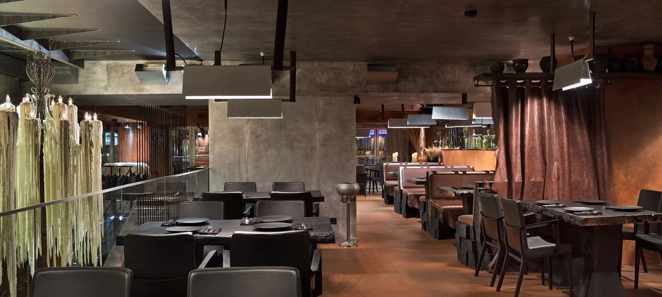 Interior design project by Belenko Design Studio (2016). Restaurant, Kyiv, Ukraine. Services: concept, interior design. Design features: bold interior elements, industrial touches, contemporary styling, open flame cooking concept.