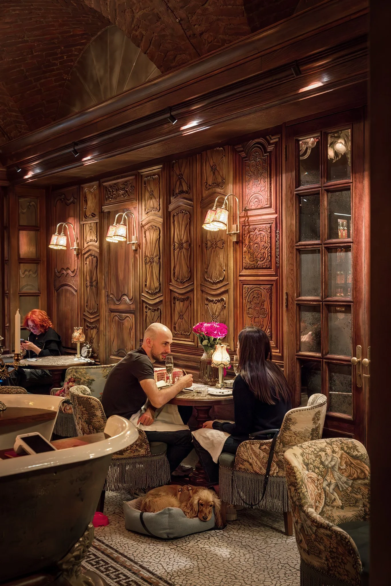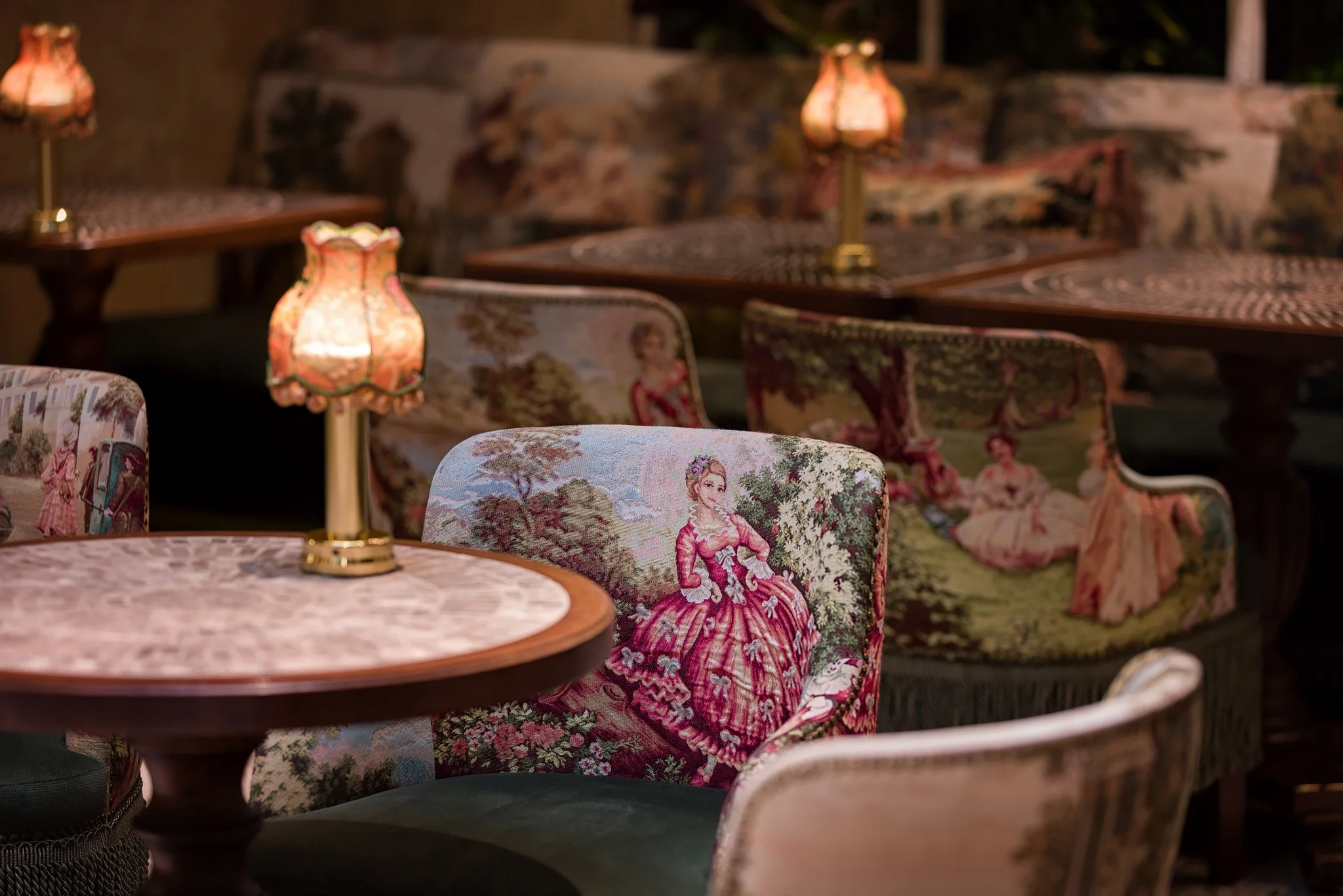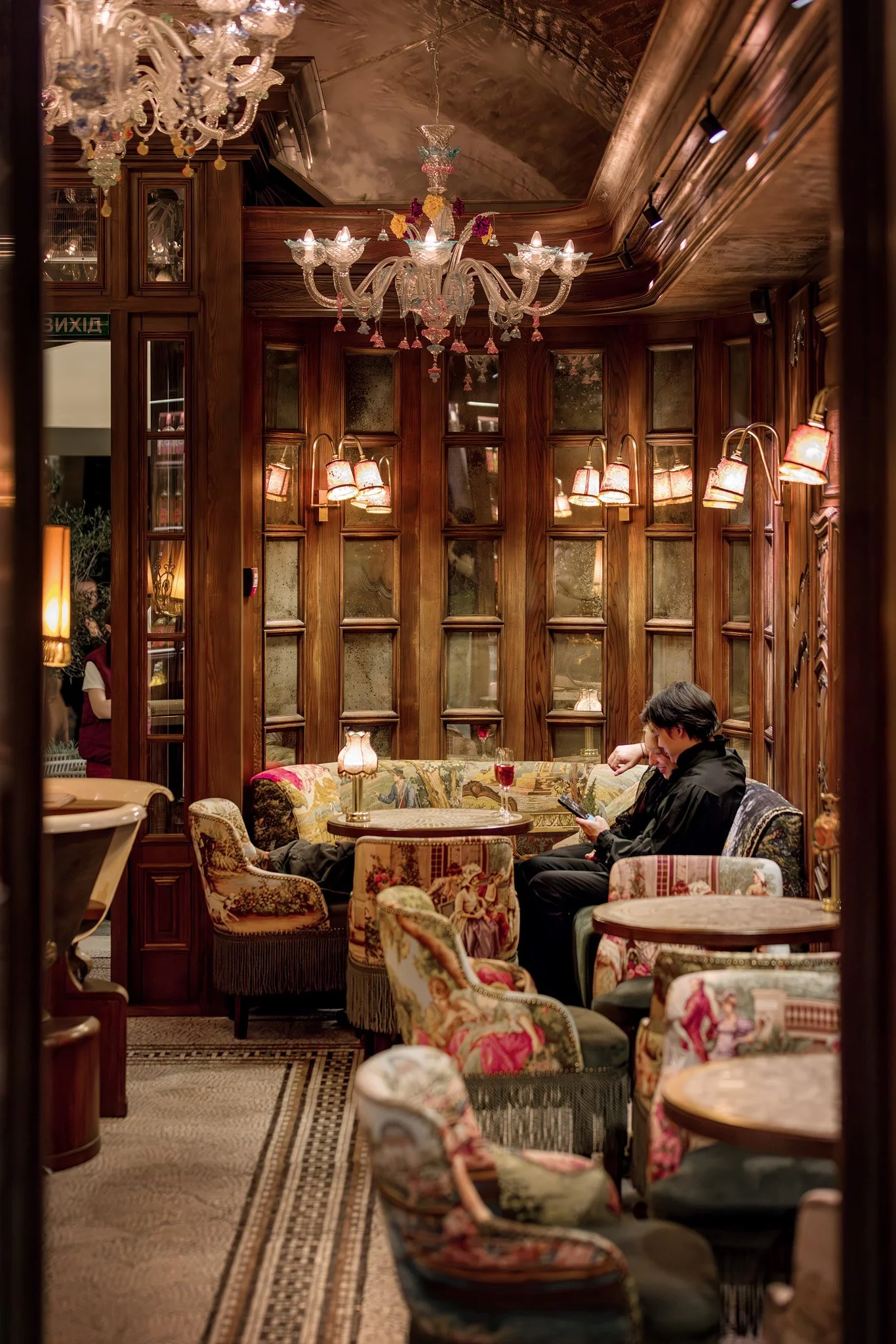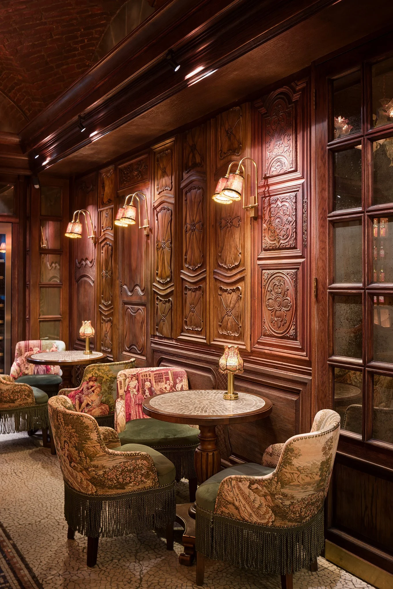 Interior design project by Belenko Design Studio (2024). Luxury restaurant, Lviv, Ukraine. Services: concept, interior design, architecture. Design features: vintage-inspired aesthetic, ornate wooden paneling, decorative chandeliers, tapestry-upholstered furniture, timeless elegance.