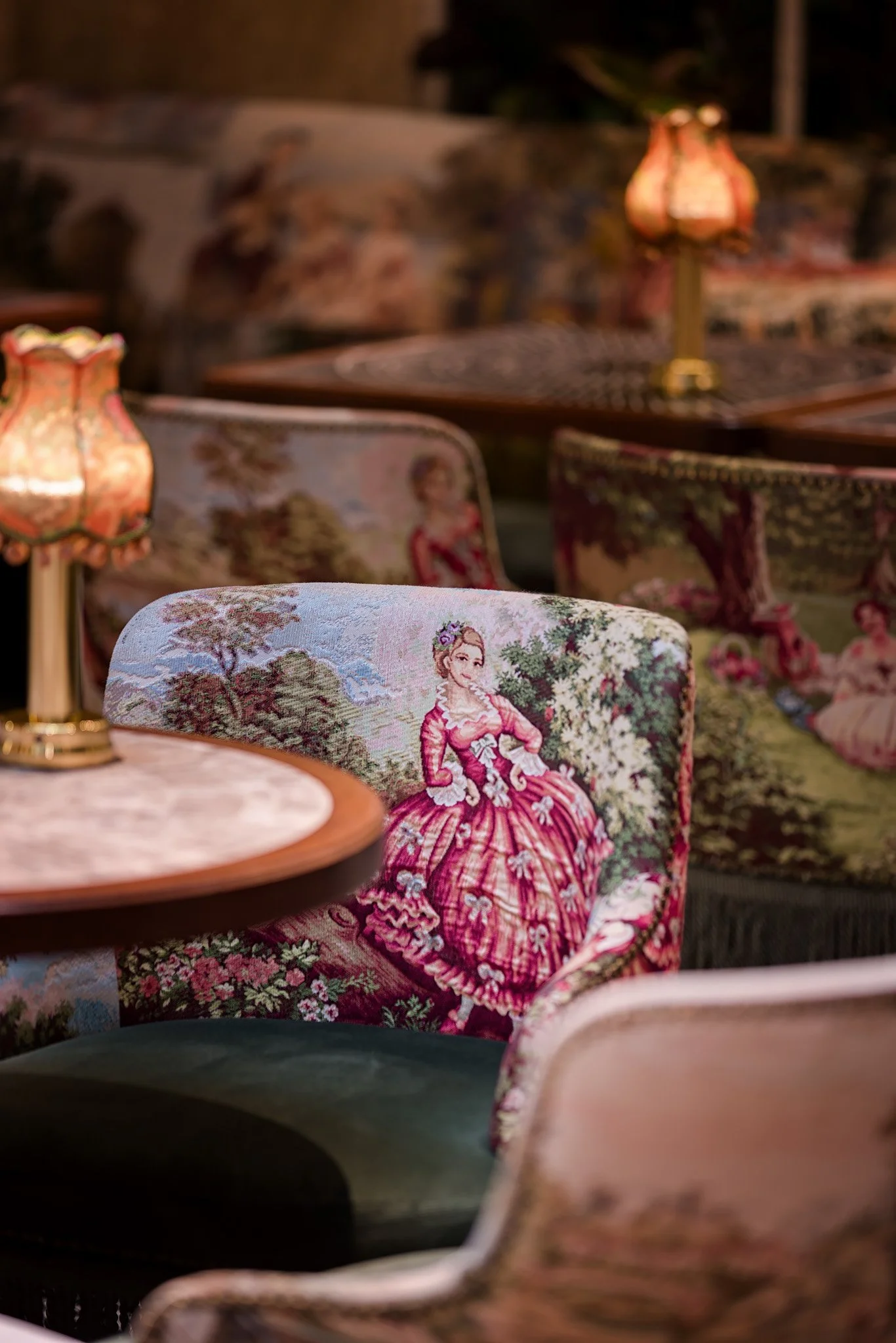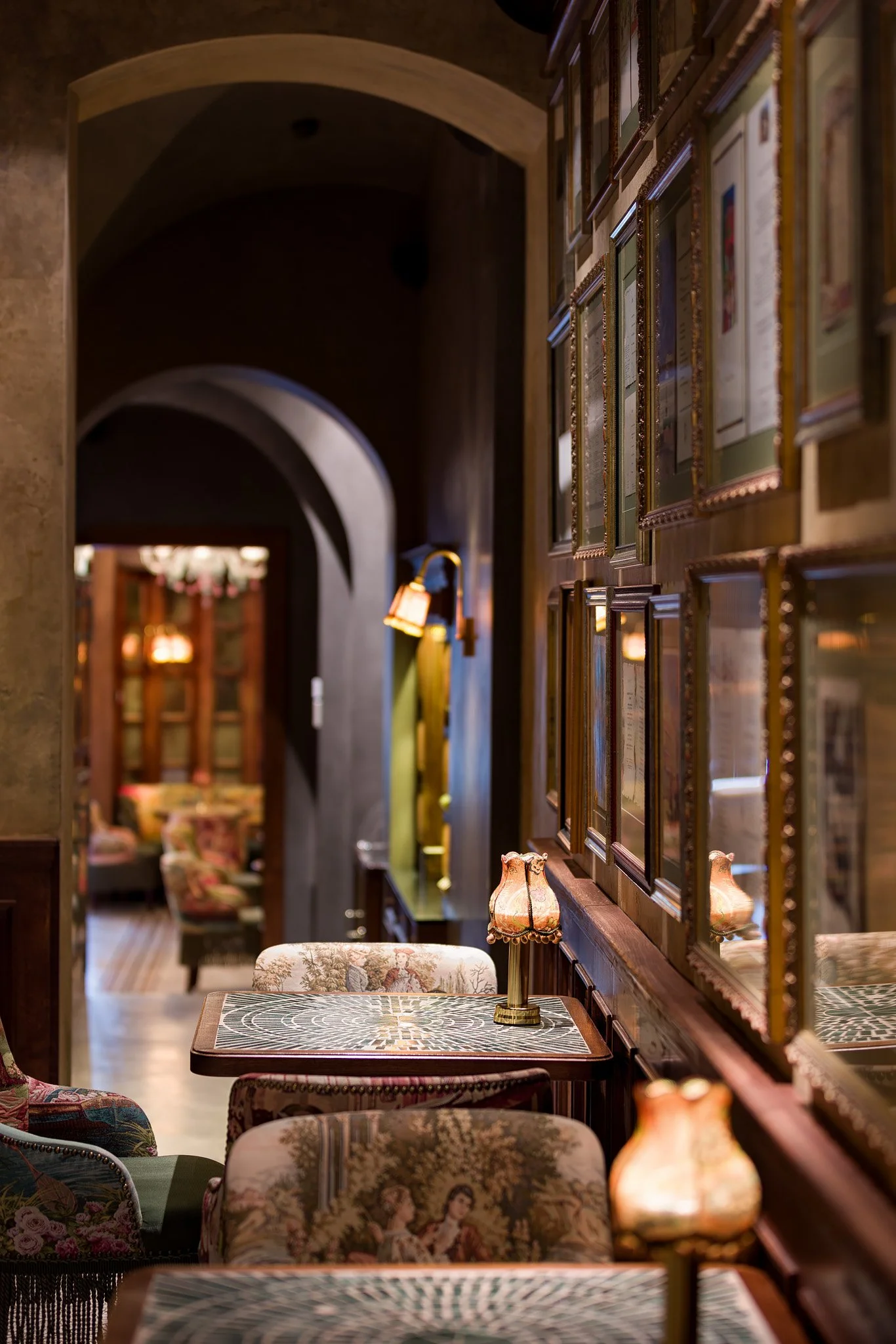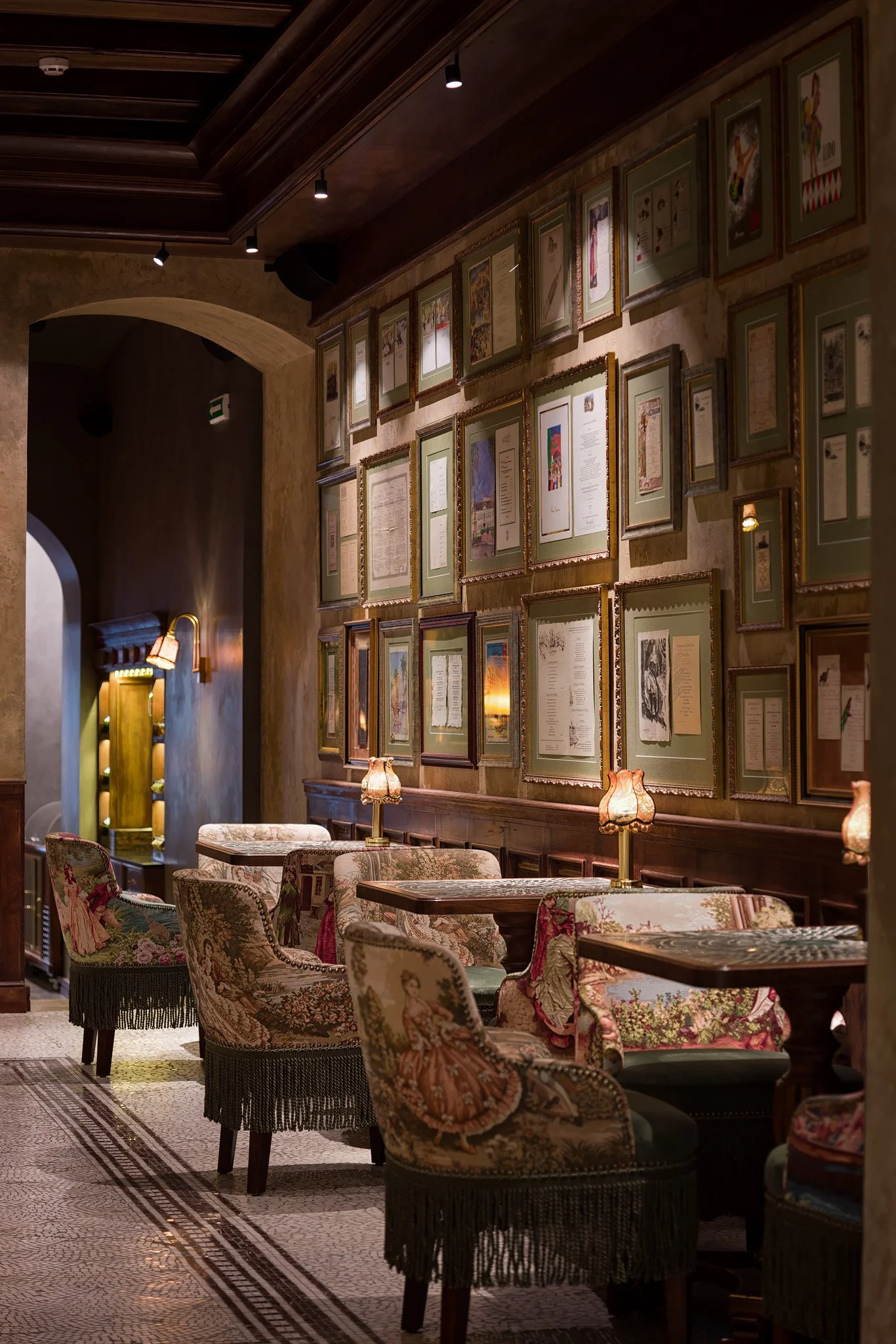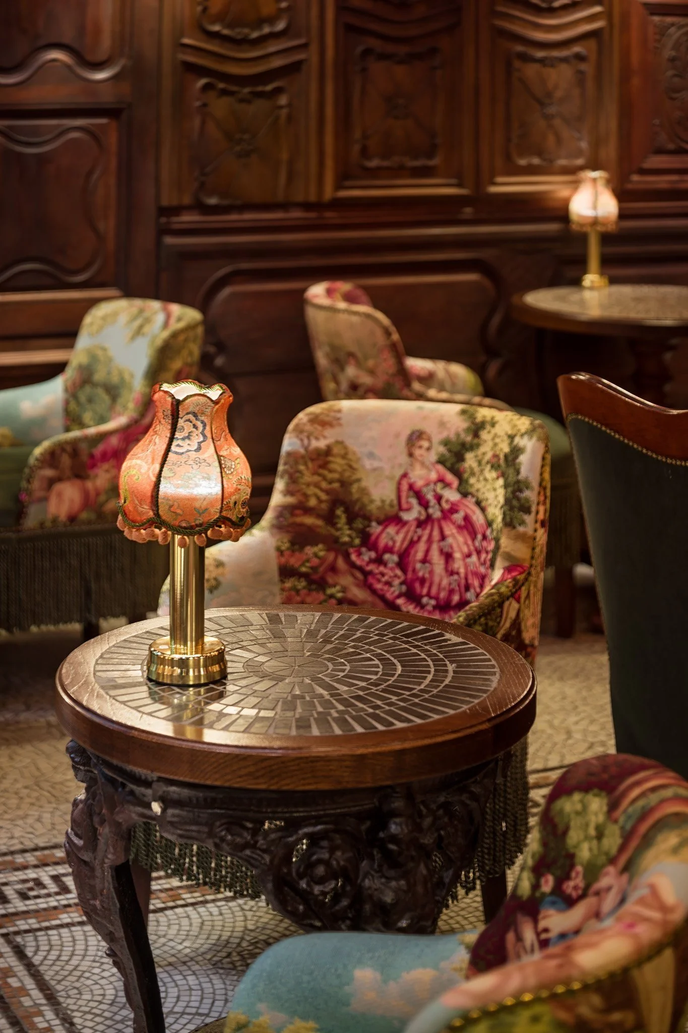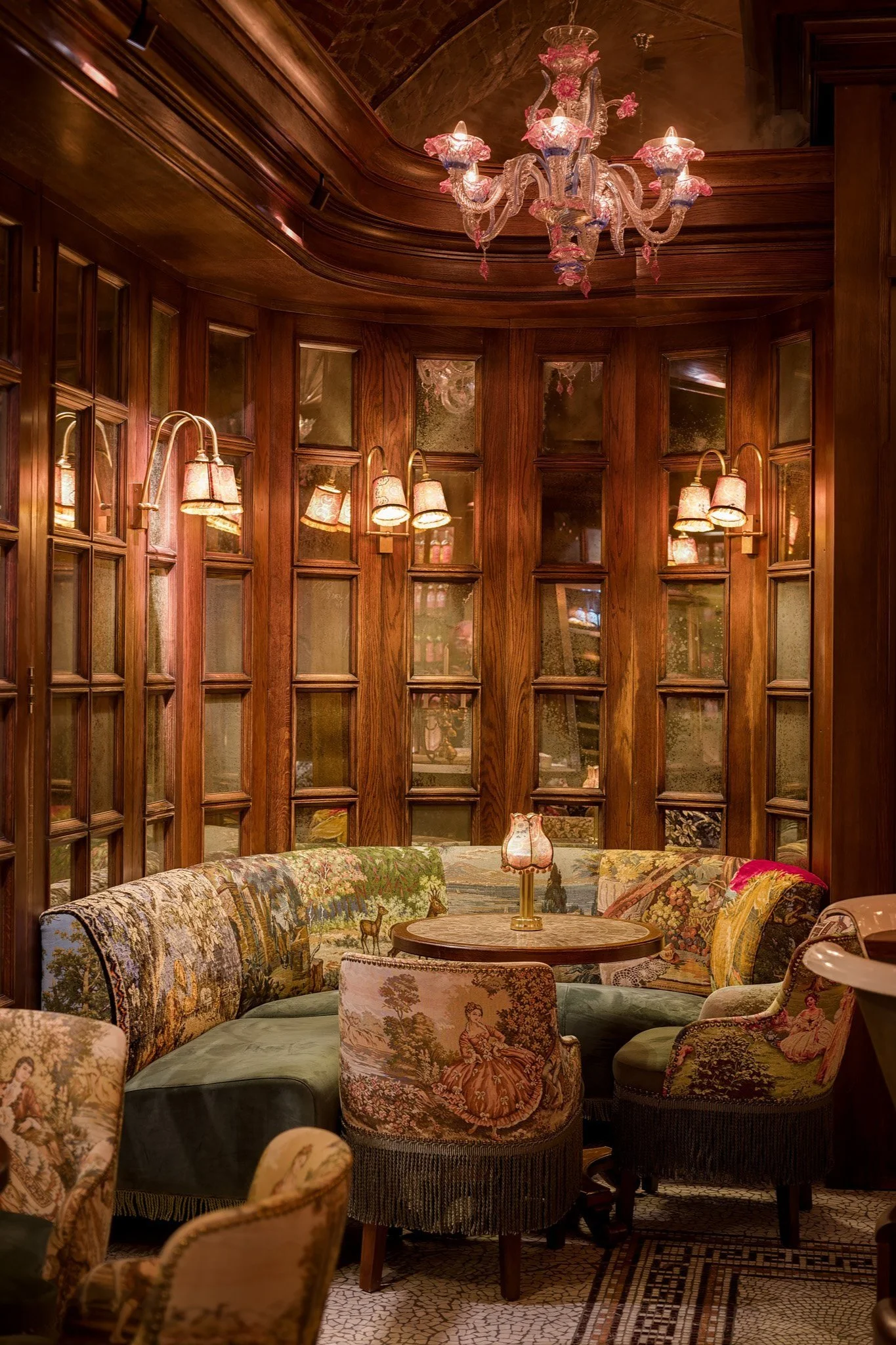 Interior design project by Belenko Design Studio (2024). Luxury restaurant, Lviv, Ukraine. Services: concept, interior design, architecture. Design features: vintage-inspired aesthetic, ornate wooden paneling, decorative chandeliers, tapestry-upholstered furniture, timeless elegance.