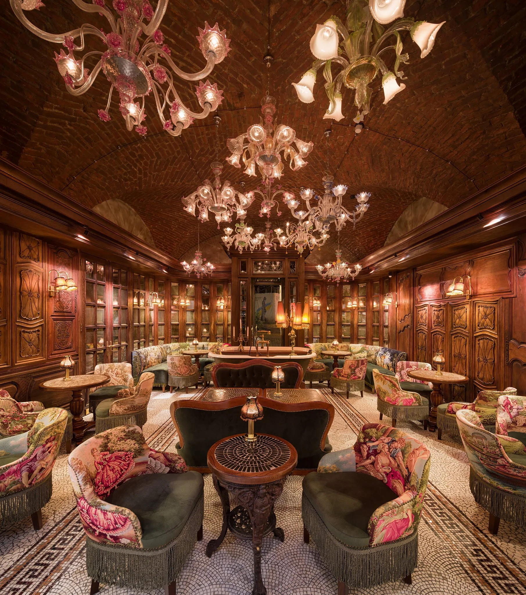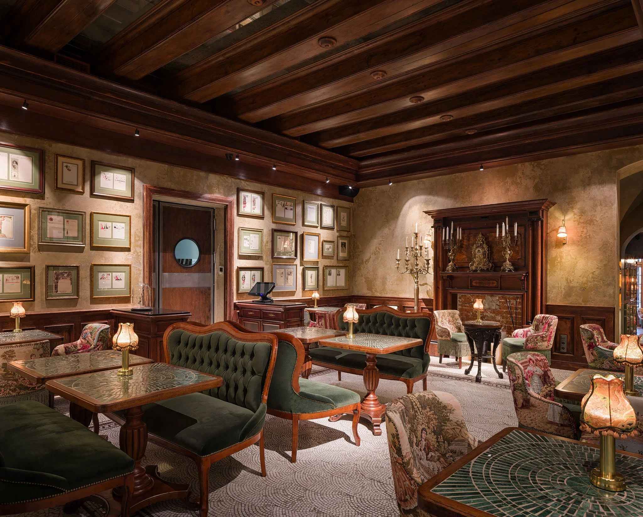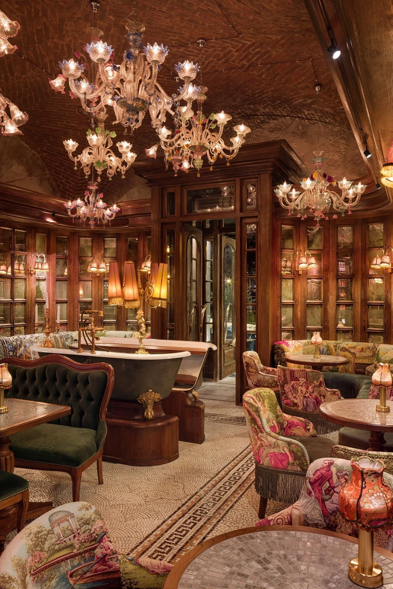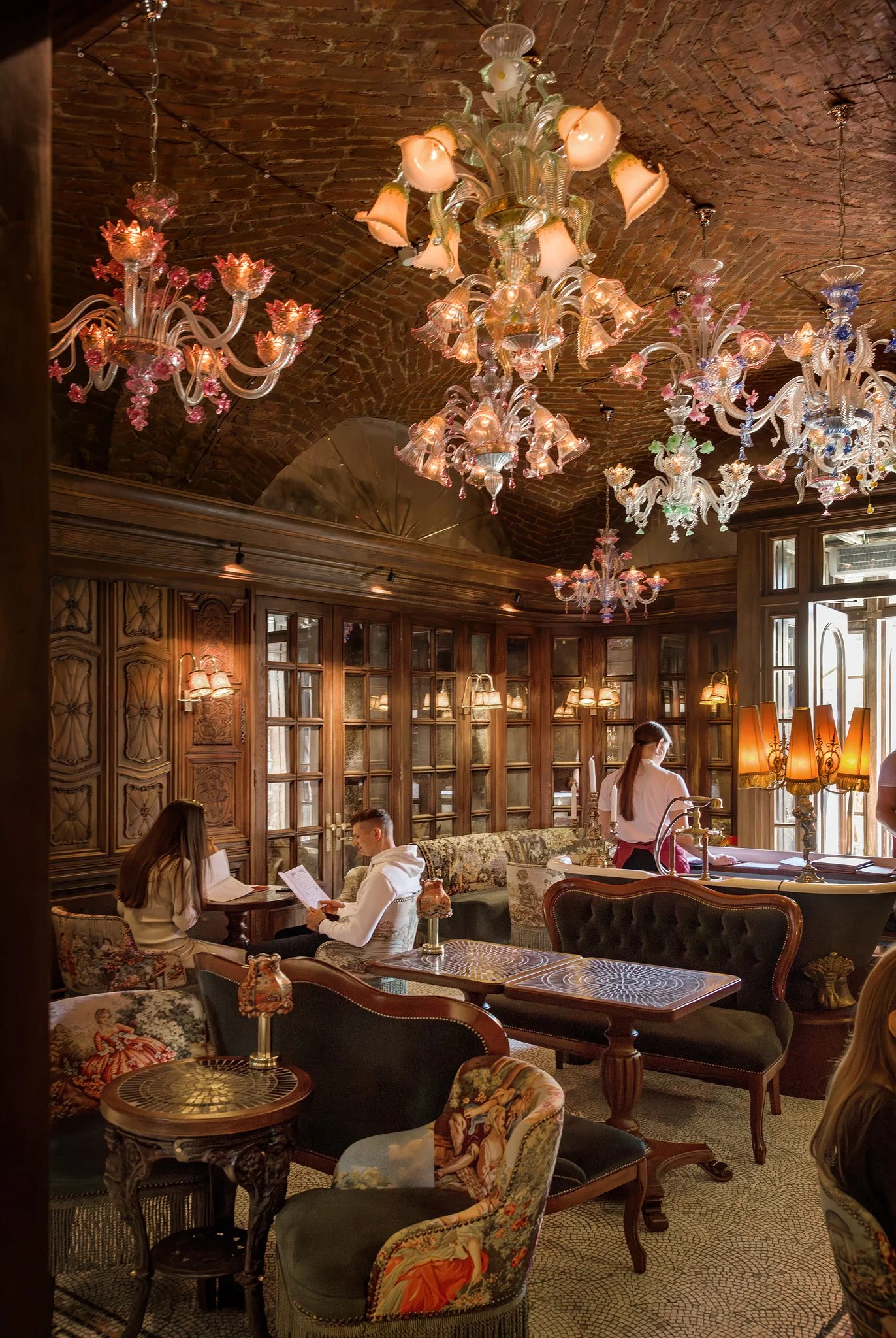 Interior design project by Belenko Design Studio (2024). Luxury restaurant, Lviv, Ukraine. Services: concept, interior design, architecture. Design features: vintage-inspired aesthetic, ornate wooden paneling, decorative chandeliers, tapestry-upholstered furniture, timeless elegance.