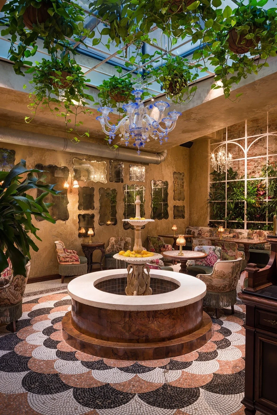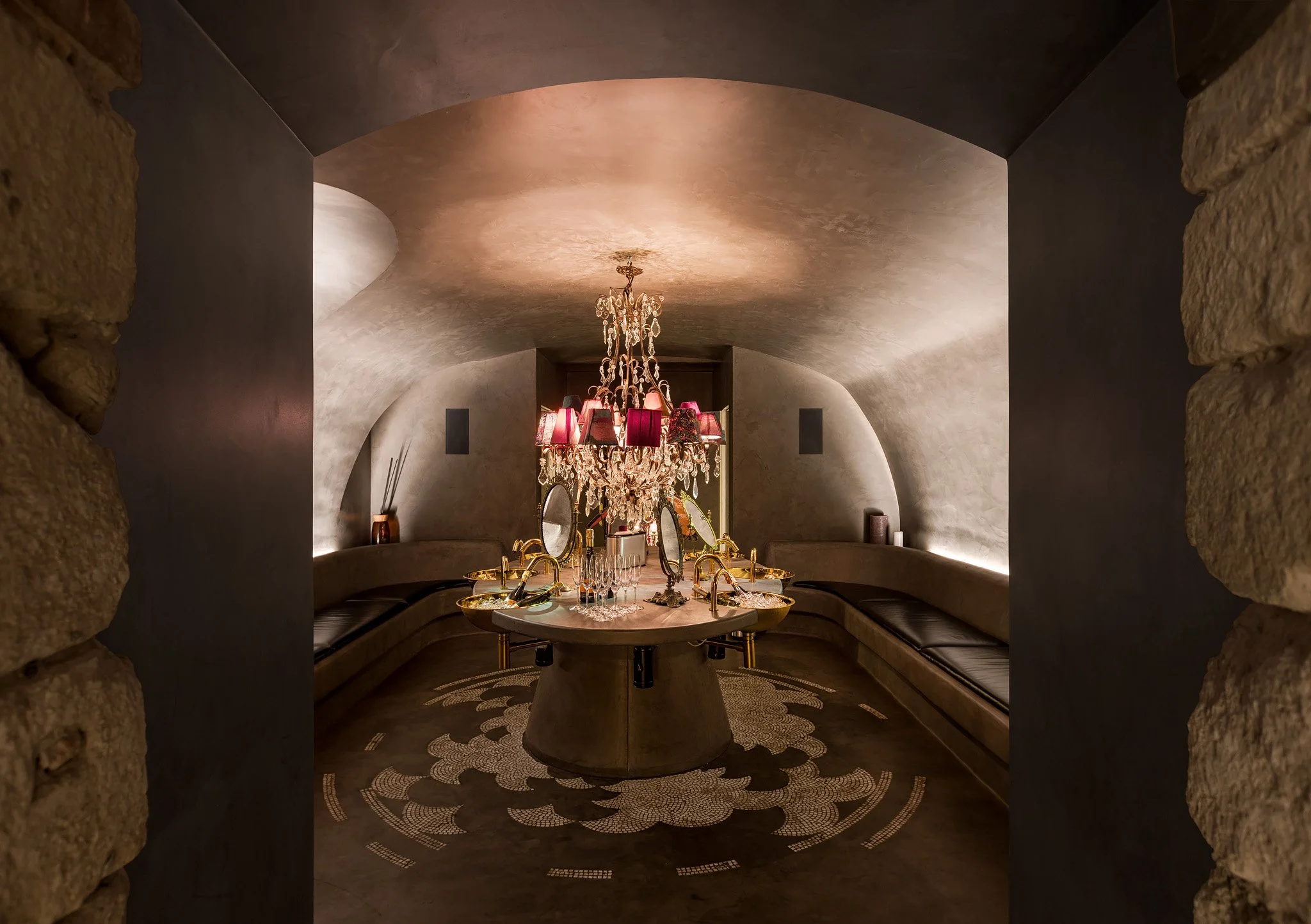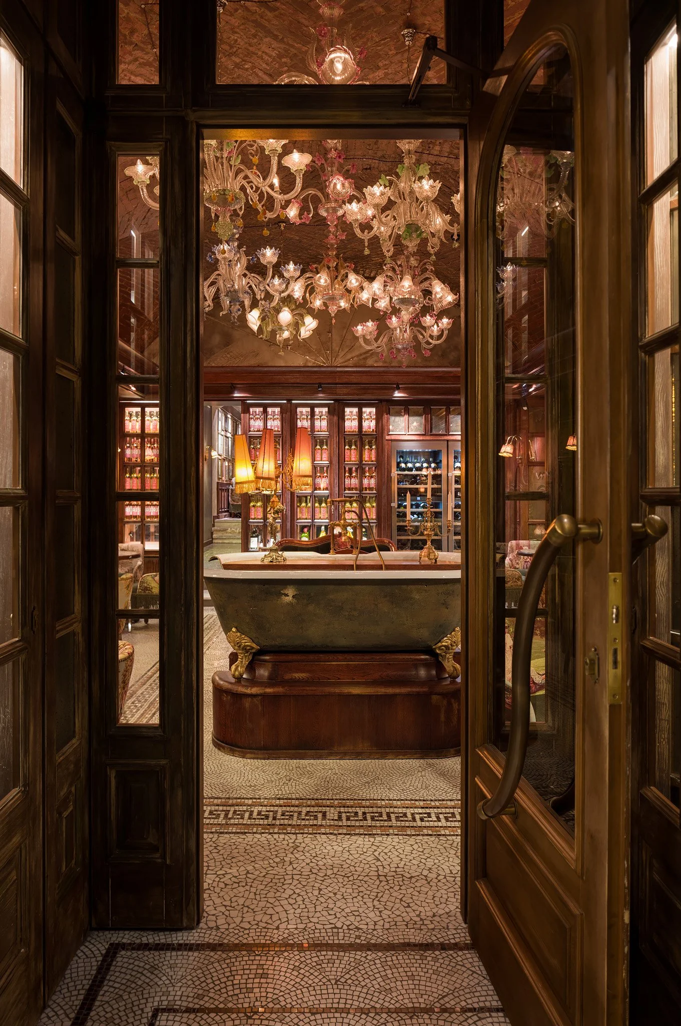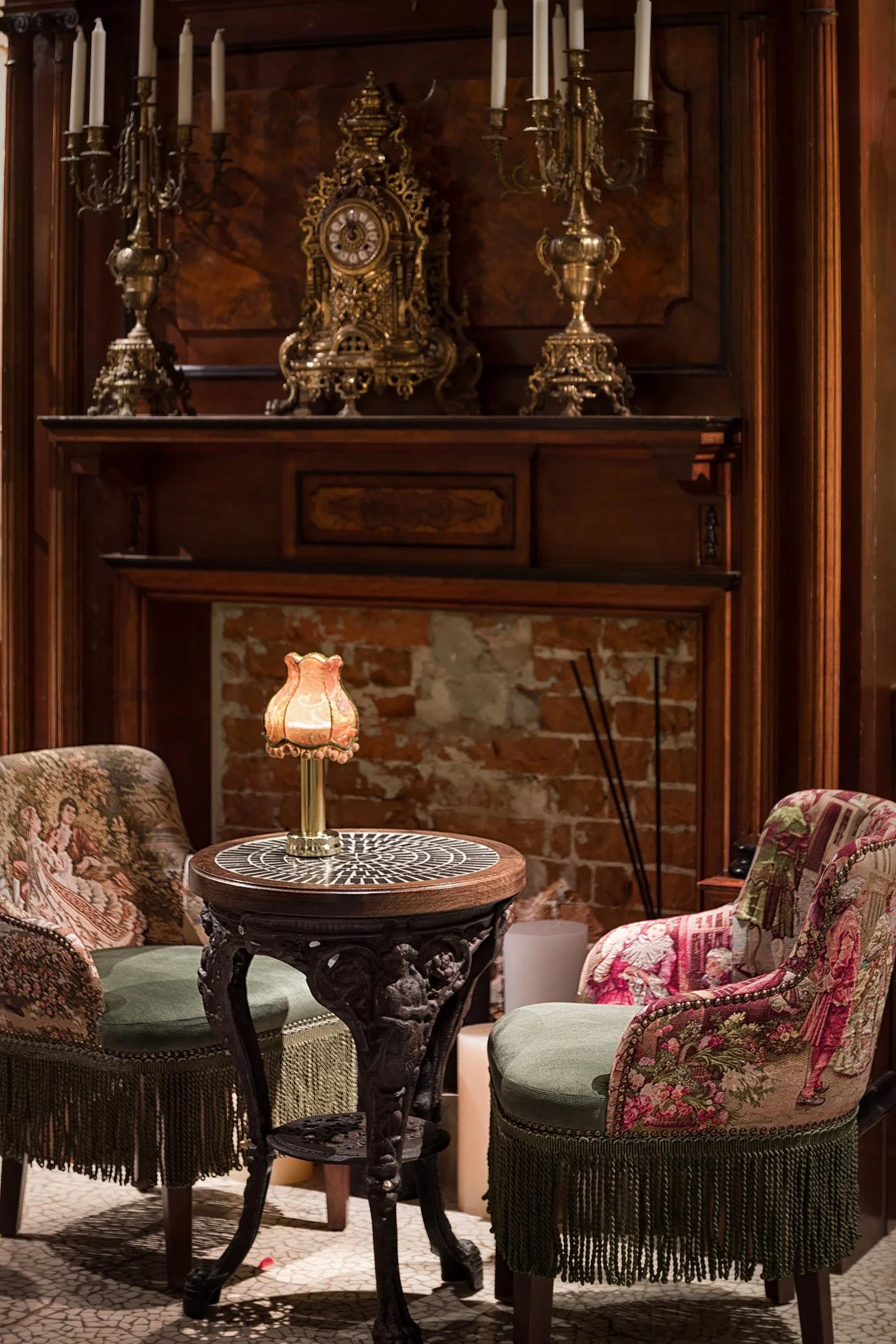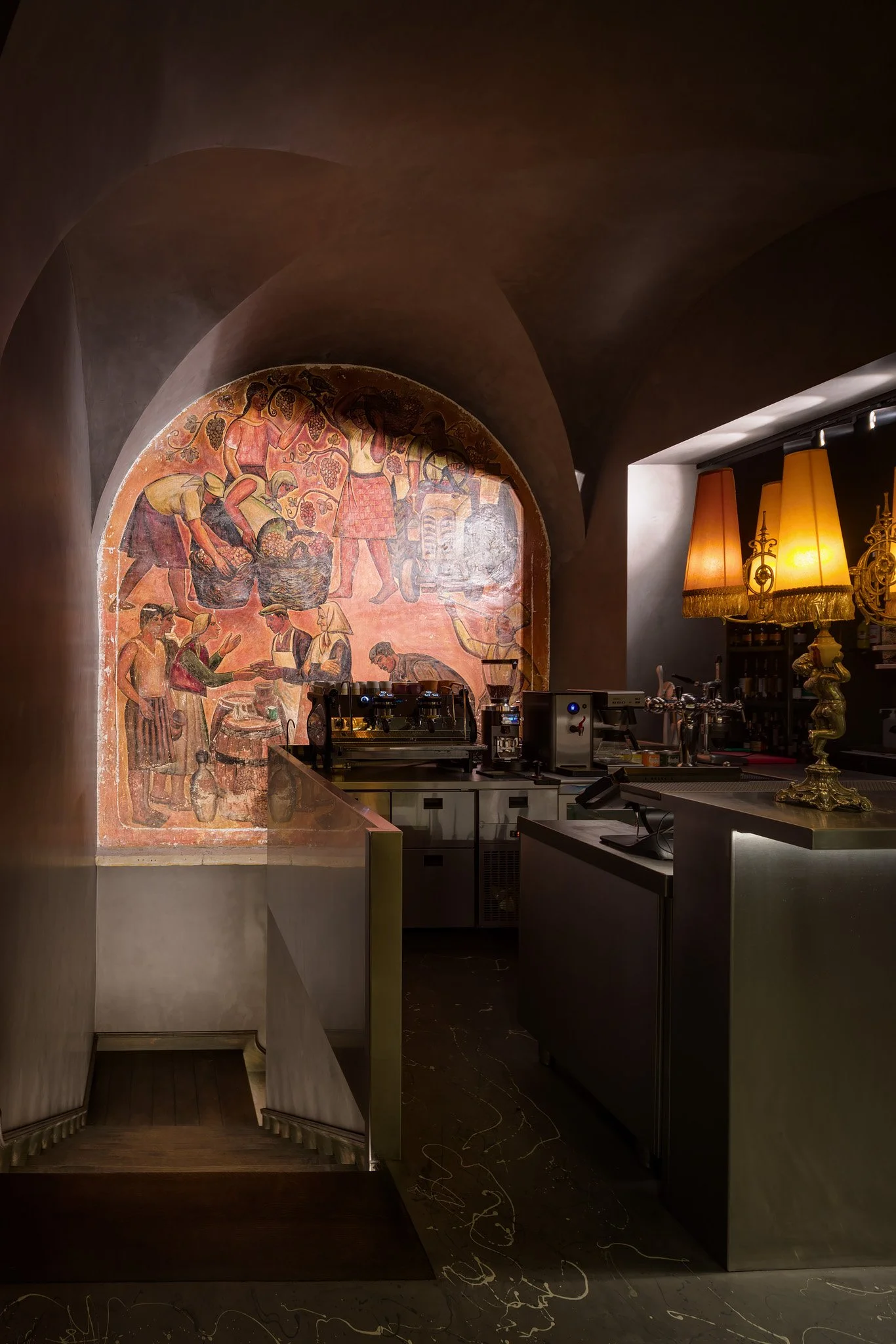 Interior design project by Belenko Design Studio (2024). Luxury restaurant, Lviv, Ukraine. Services: concept, interior design, architecture. Design features: vintage-inspired aesthetic, ornate wooden paneling, decorative chandeliers, tapestry-upholstered furniture, timeless elegance.