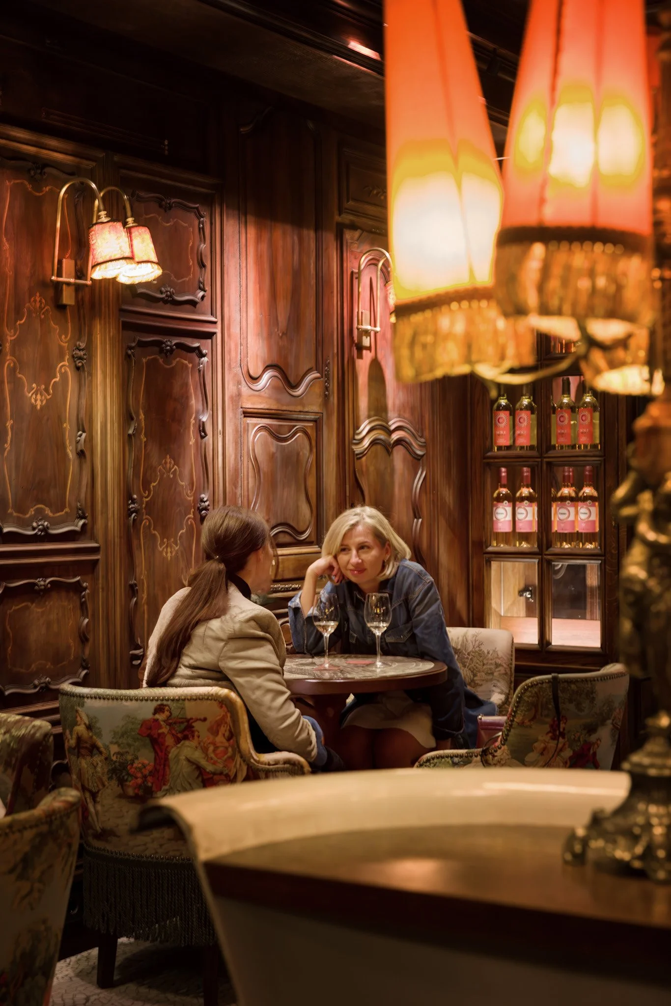 Interior design project by Belenko Design Studio (2024). Luxury restaurant, Lviv, Ukraine. Services: concept, interior design, architecture. Design features: vintage-inspired aesthetic, ornate wooden paneling, decorative chandeliers, tapestry-upholstered furniture, timeless elegance.