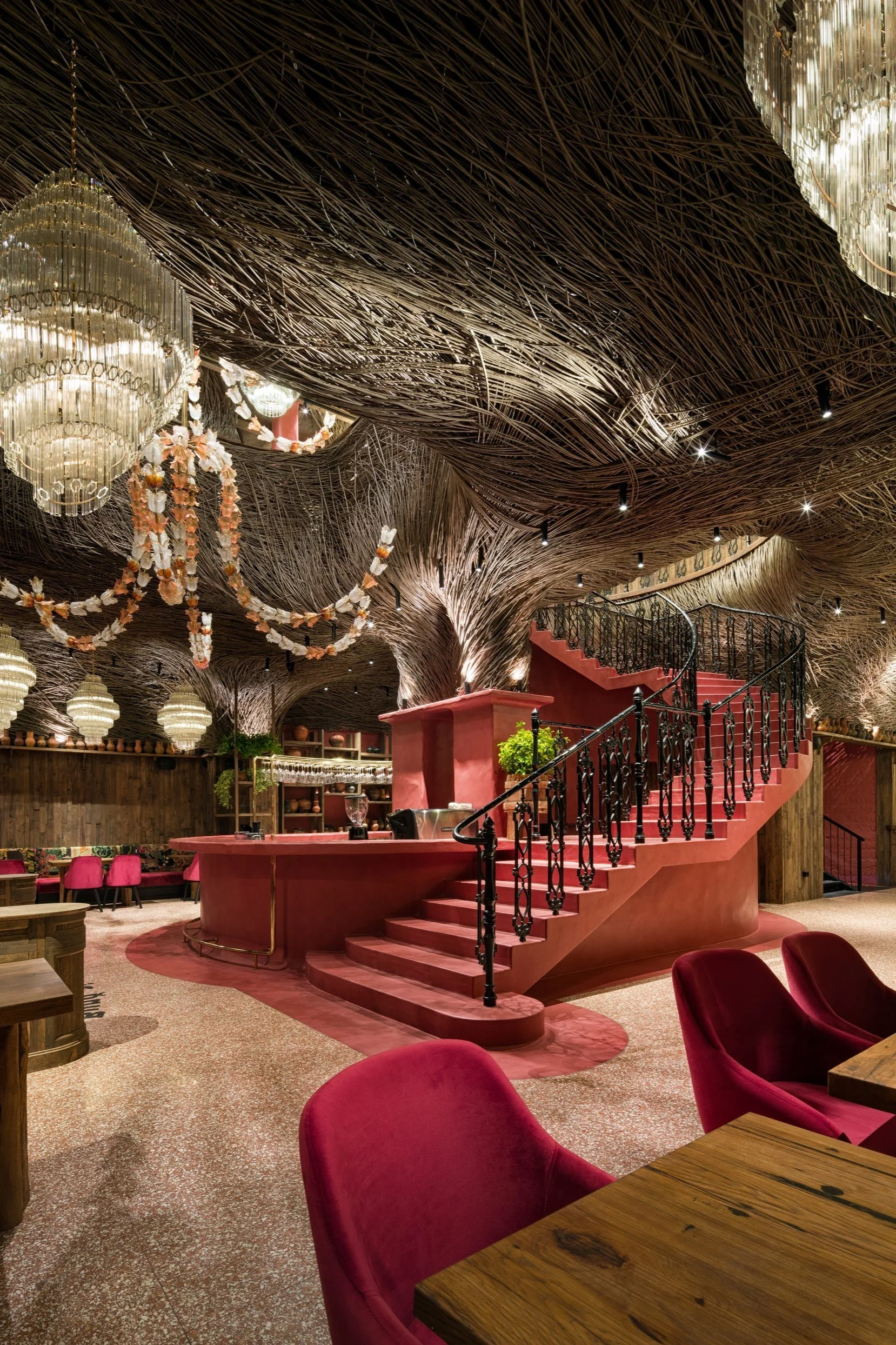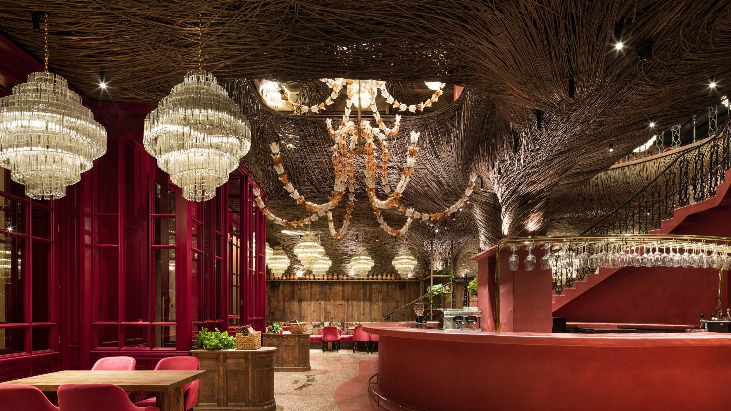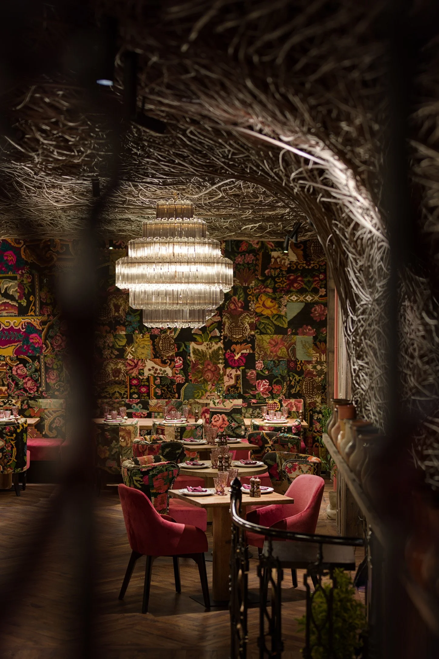 Interior design project by Belenko Design Studio (2024). Bessarabian restaurant, 356m², 203 seats, Odesa, Ukraine. Services: concept, interior design, decor. Design features: ornate chandeliers, woven reed ceilings, pink decor, floral-patterned furnishings reflecting Moldovan culinary traditions.
