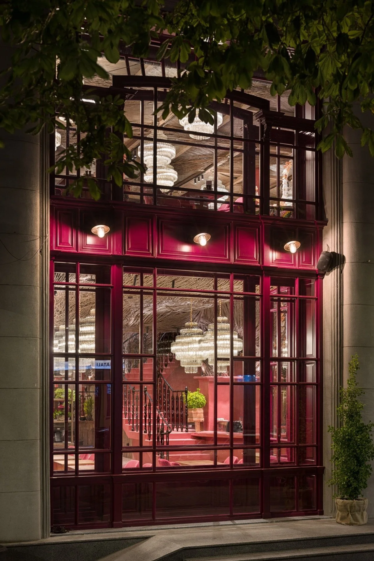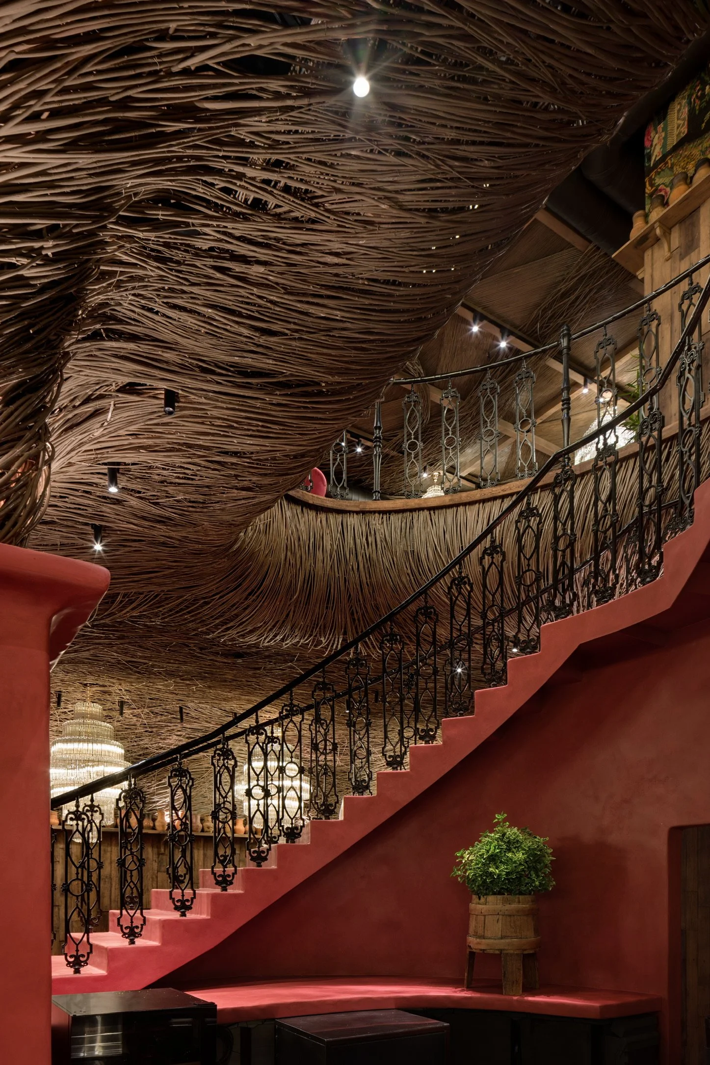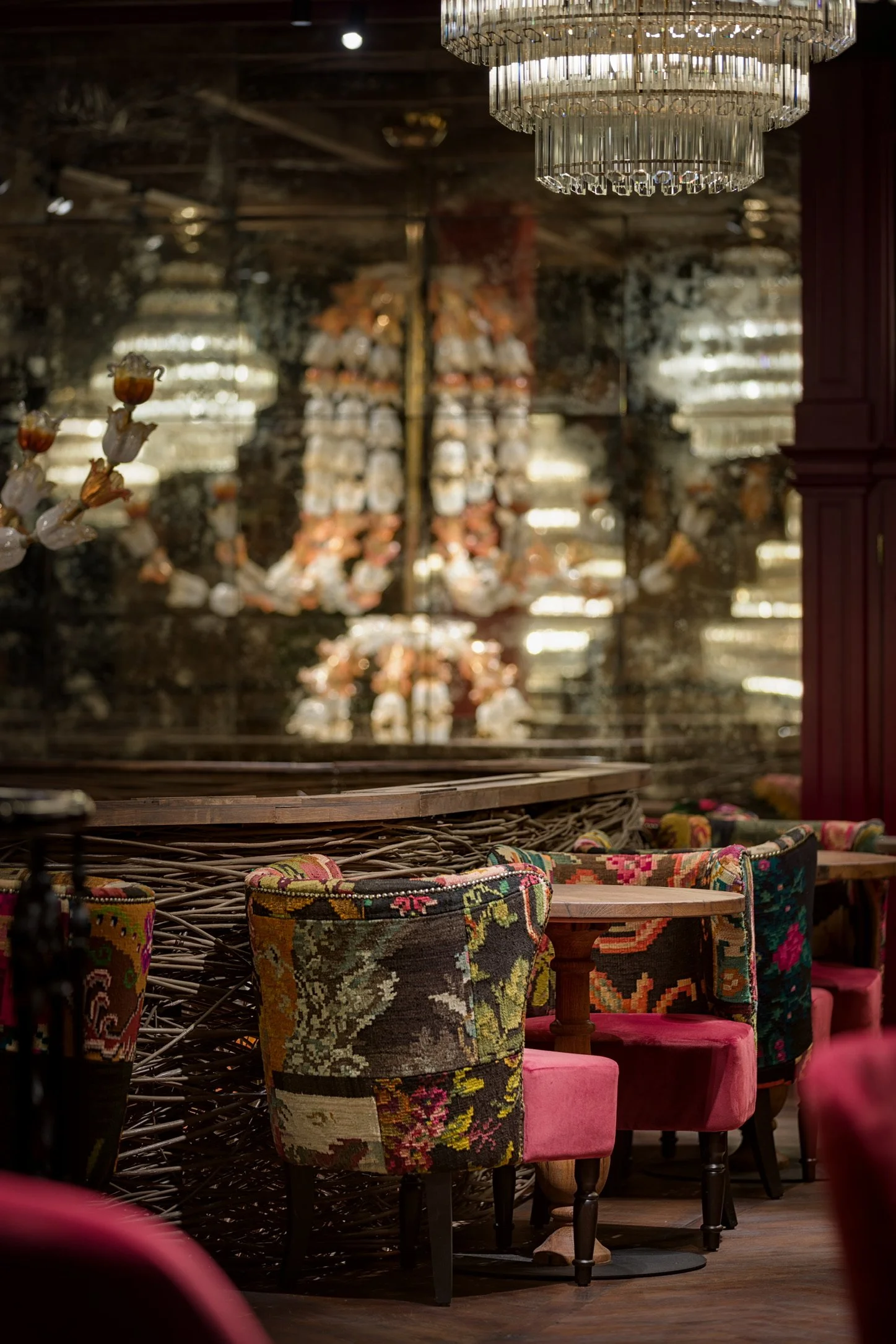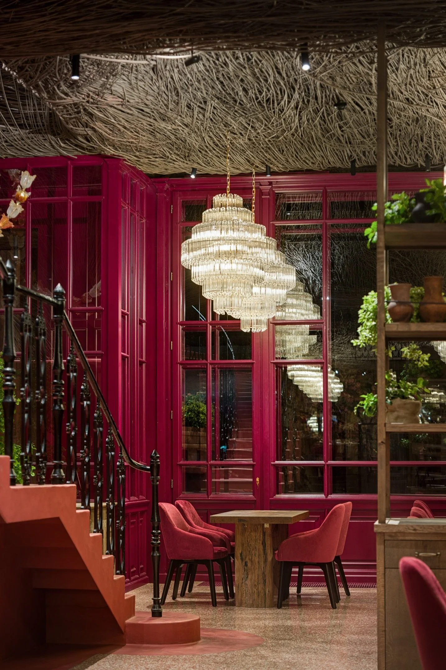 Interior design project by Belenko Design Studio (2024). Bessarabian restaurant, 356m², 203 seats, Odesa, Ukraine. Services: concept, interior design, decor. Design features: ornate chandeliers, woven reed ceilings, pink decor, floral-patterned furnishings reflecting Moldovan culinary traditions.