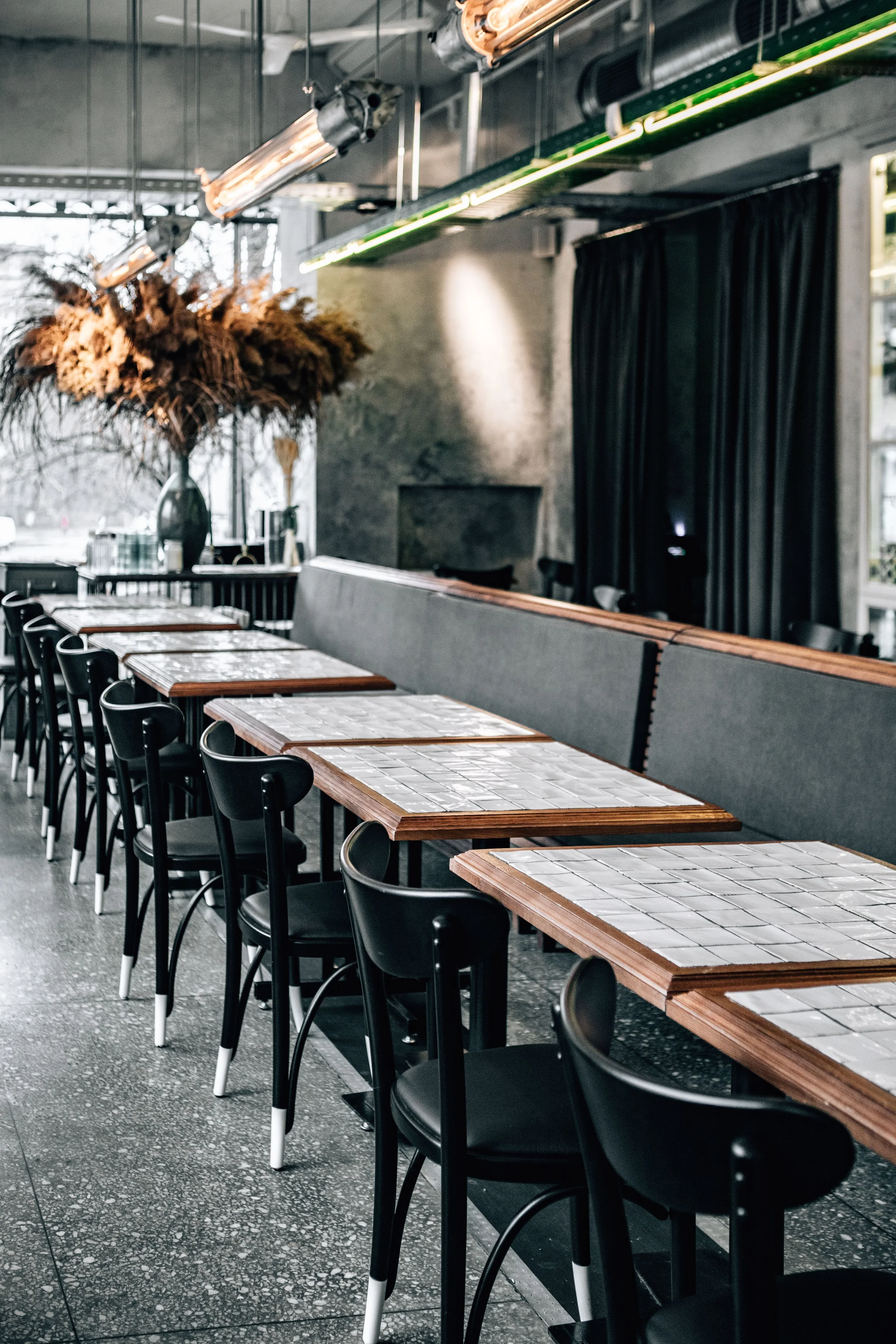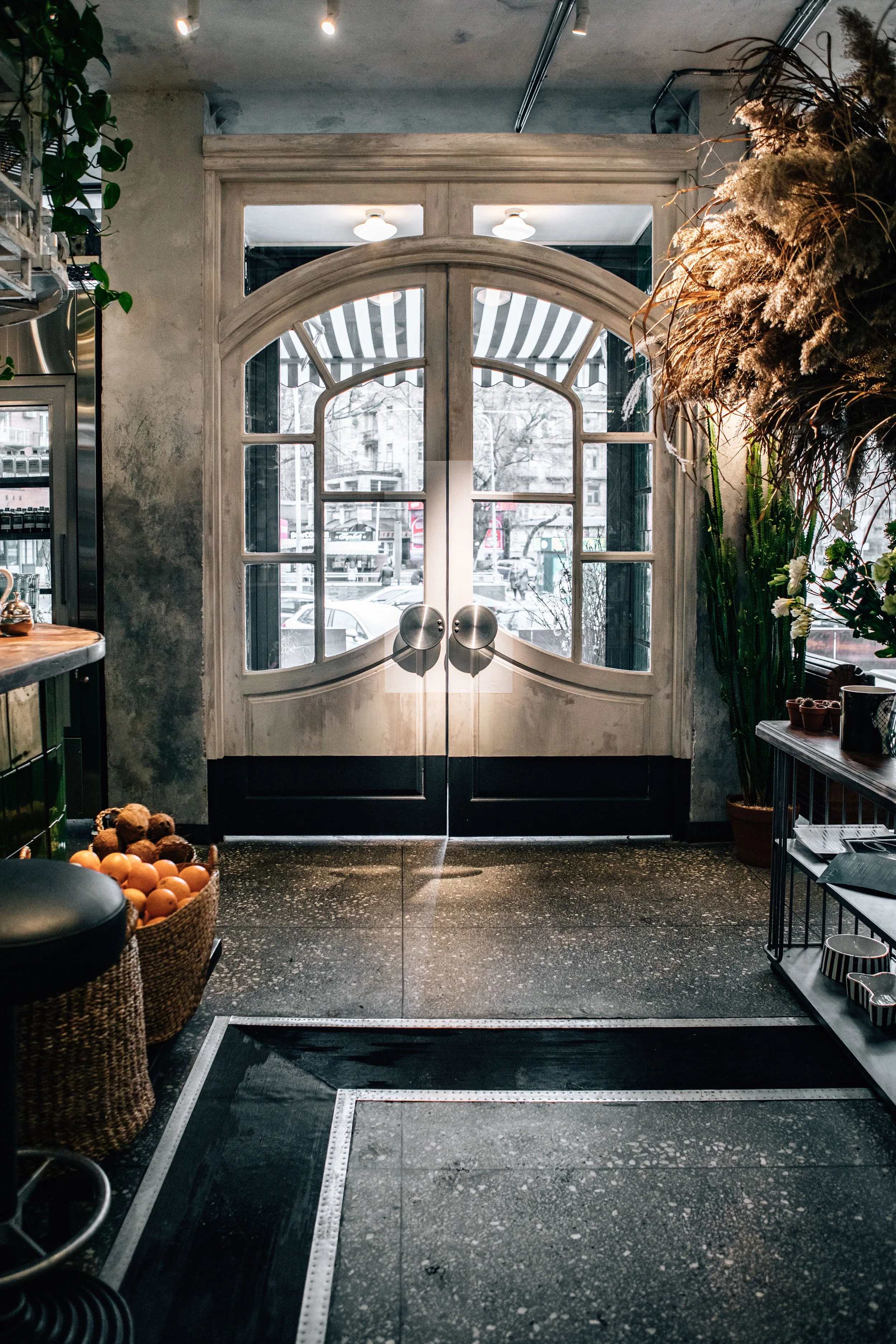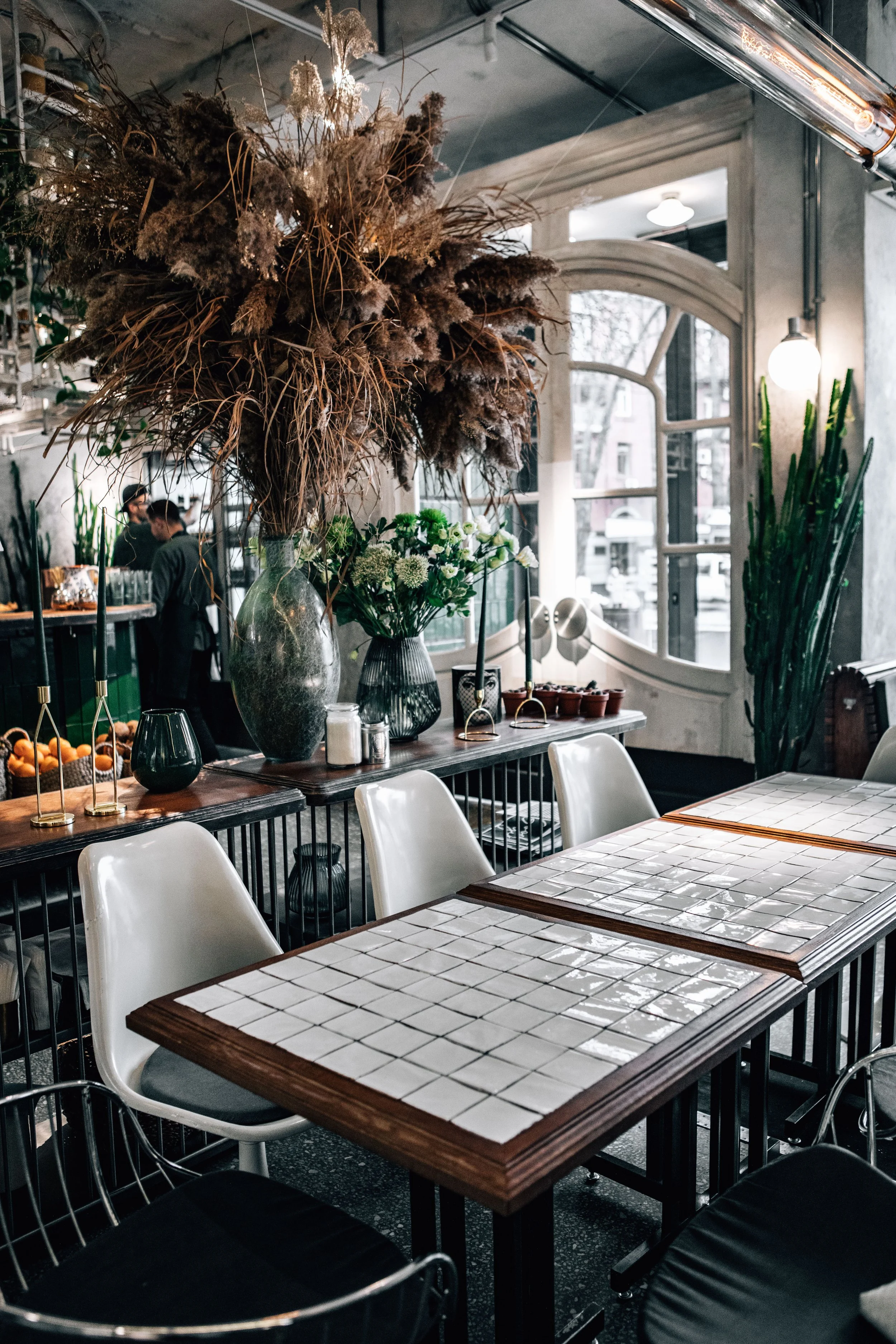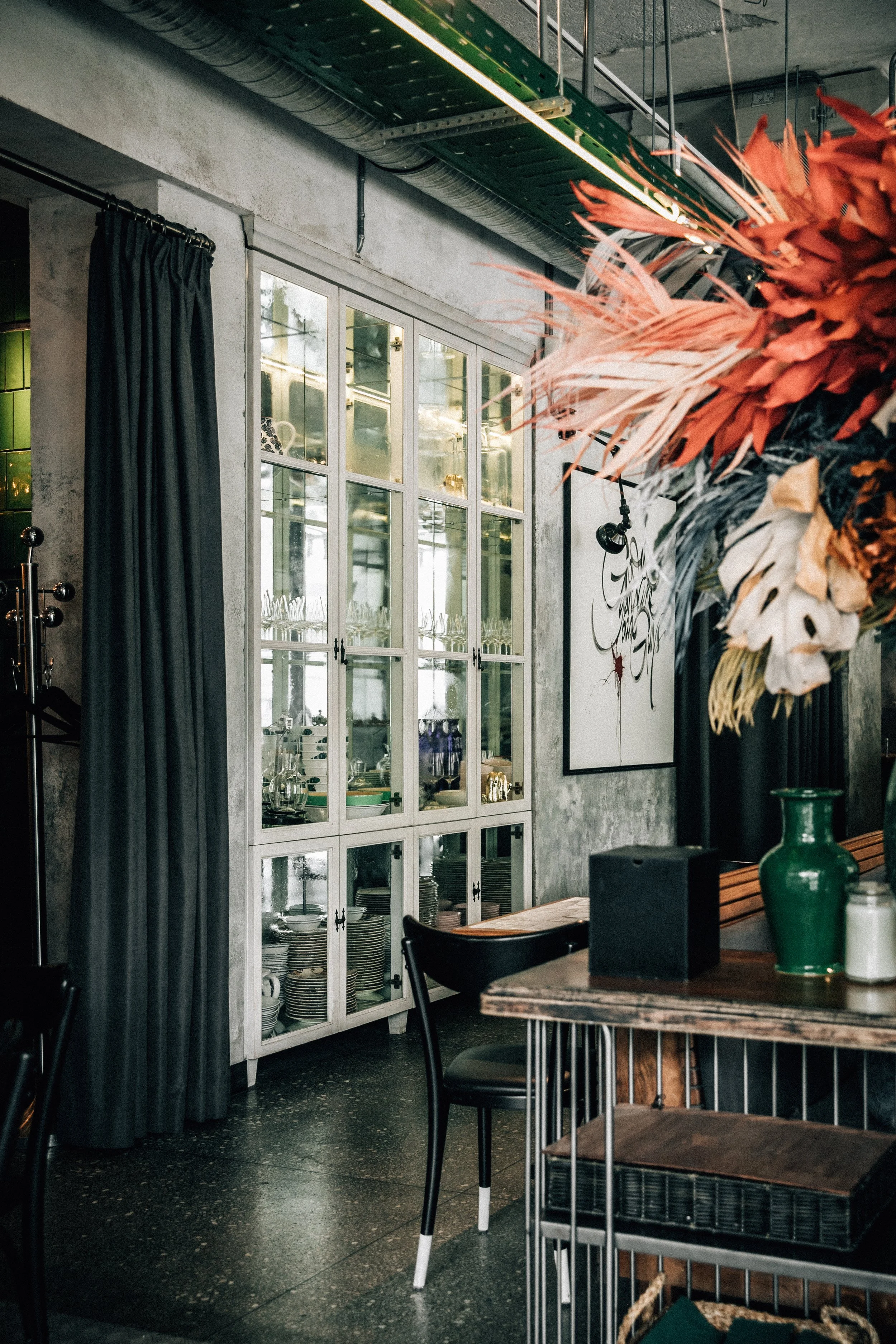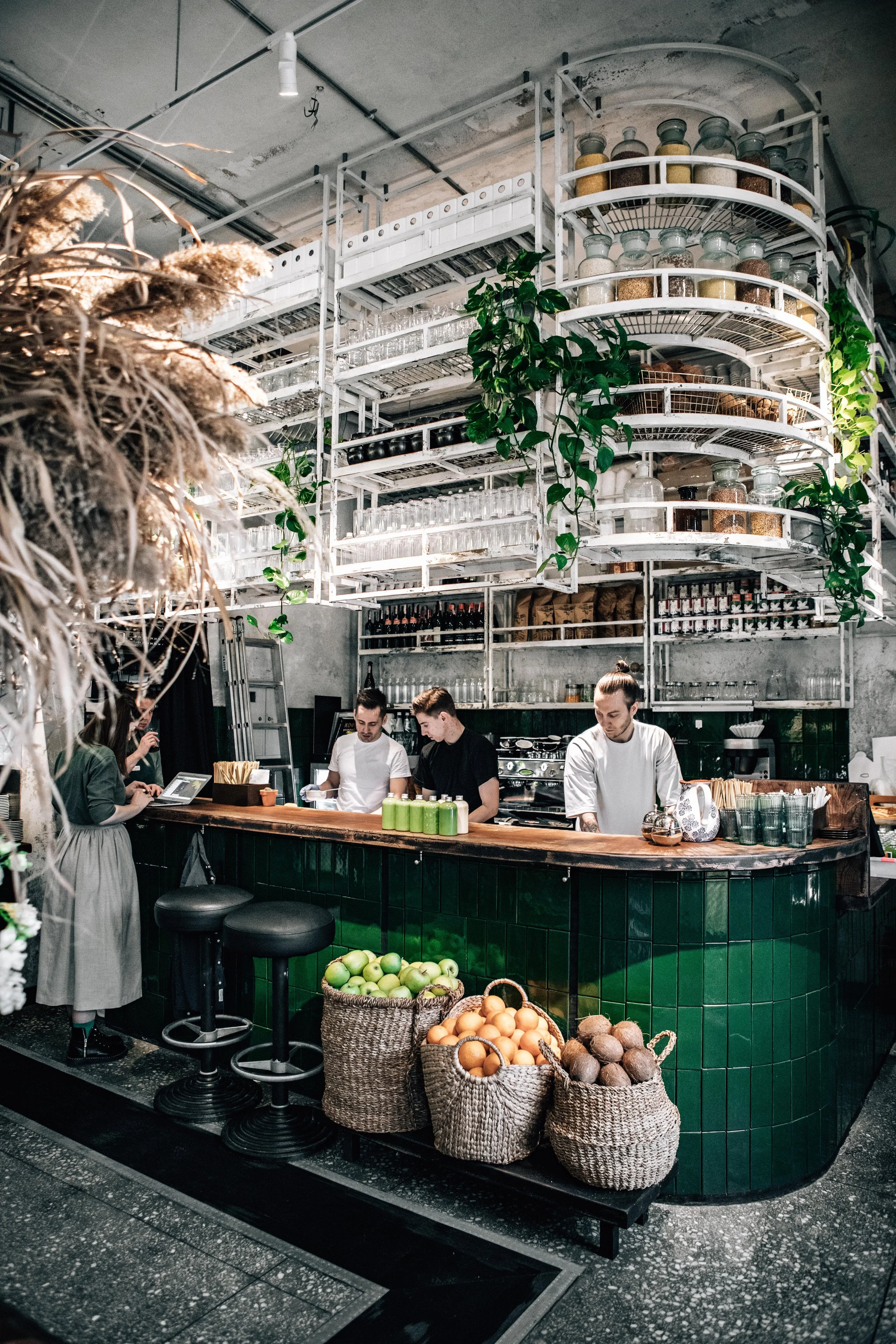 Interior design project by Belenko Design Studio (2019). Restaurant interior and exterior, Kyiv, Ukraine. Services: concept, interior design, exterior design. Design features: industrial aesthetic, green tiled counters, decorative dried flowers, concrete walls, outdoor patio.