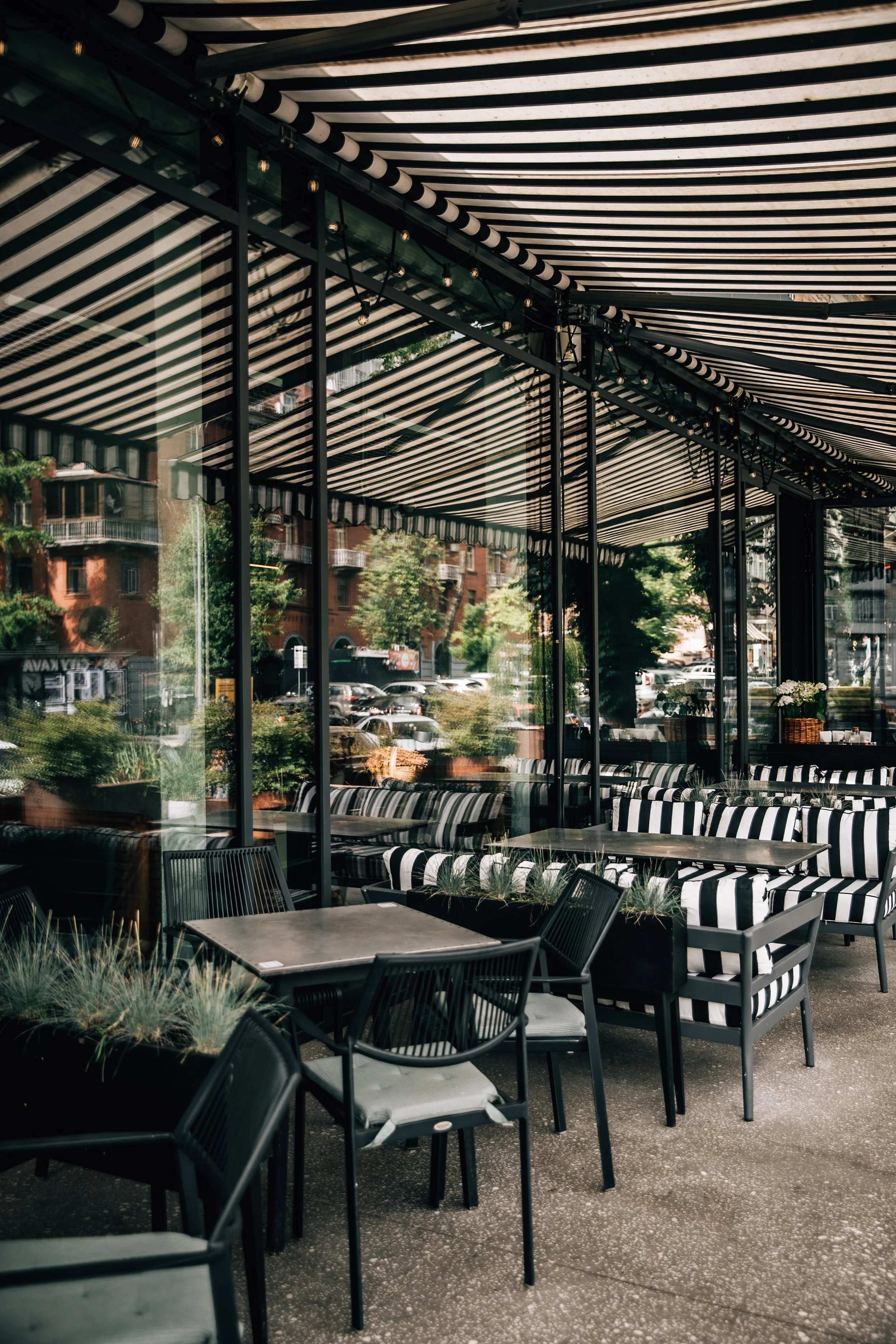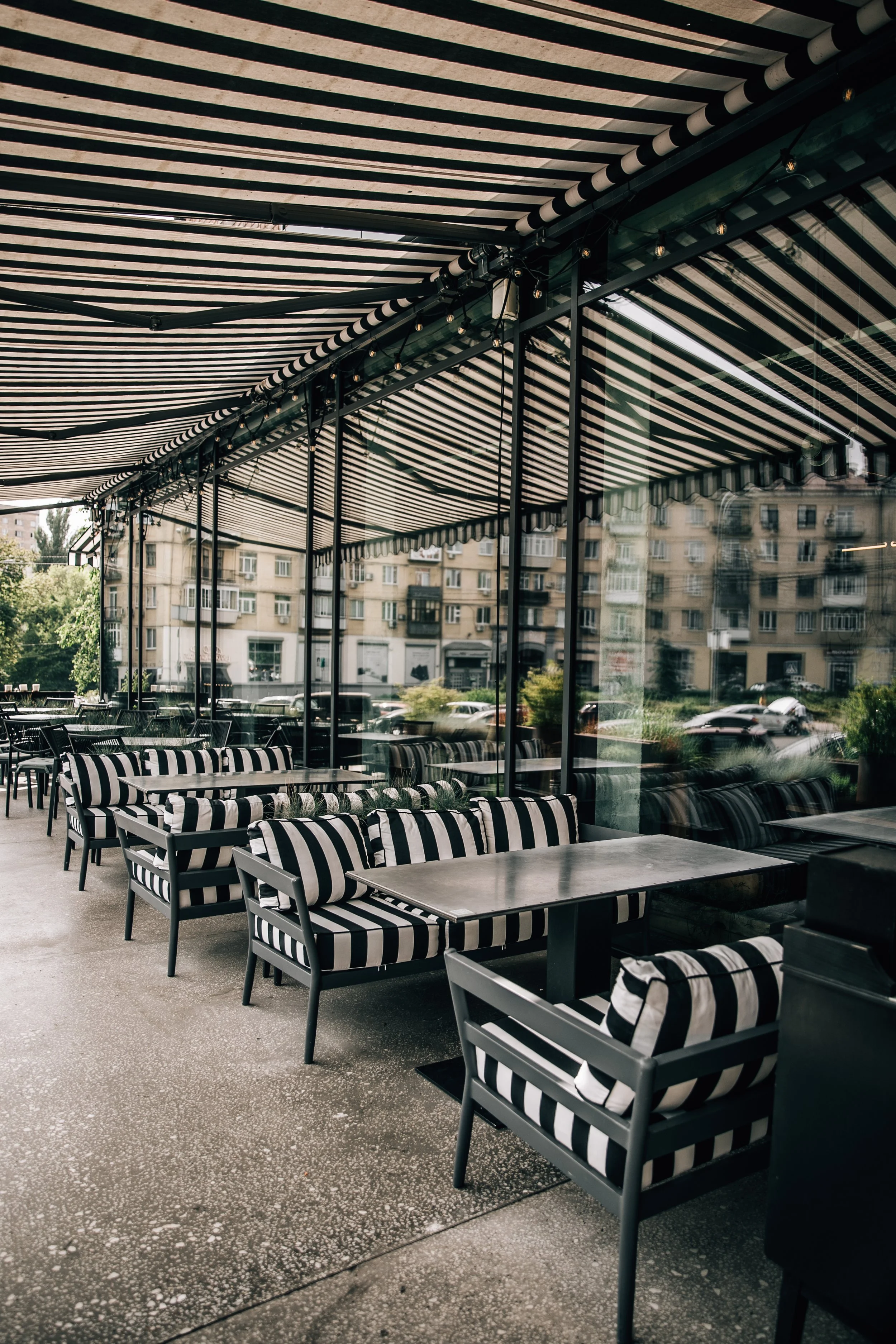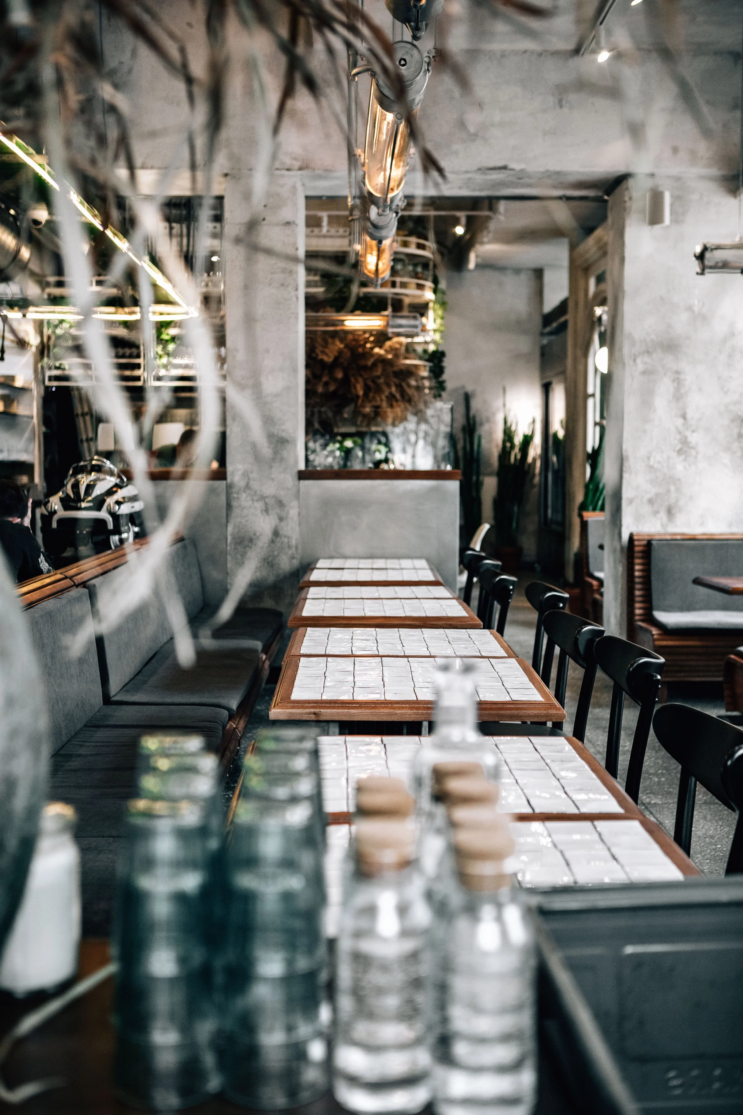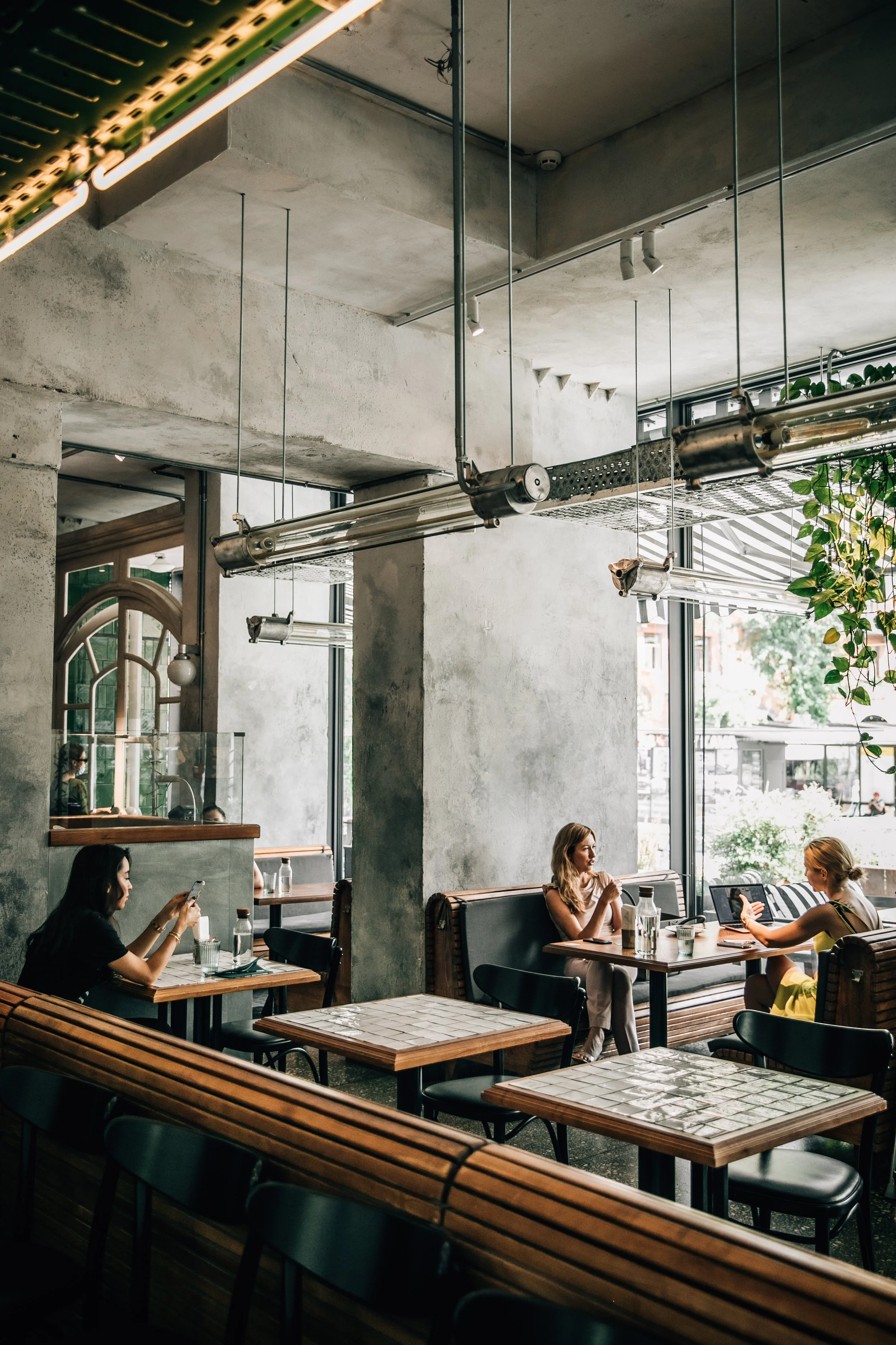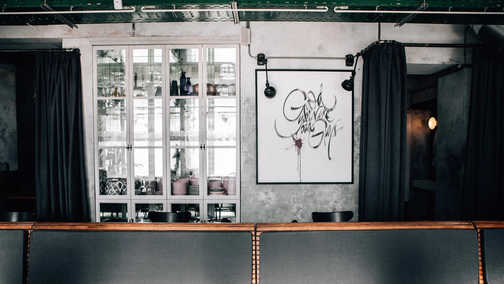 Interior design project by Belenko Design Studio (2019). Restaurant interior and exterior, Kyiv, Ukraine. Services: concept, interior design, exterior design. Design features: industrial aesthetic, green tiled counters, decorative dried flowers, concrete walls, outdoor patio.