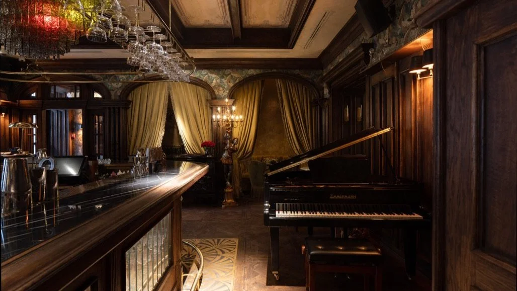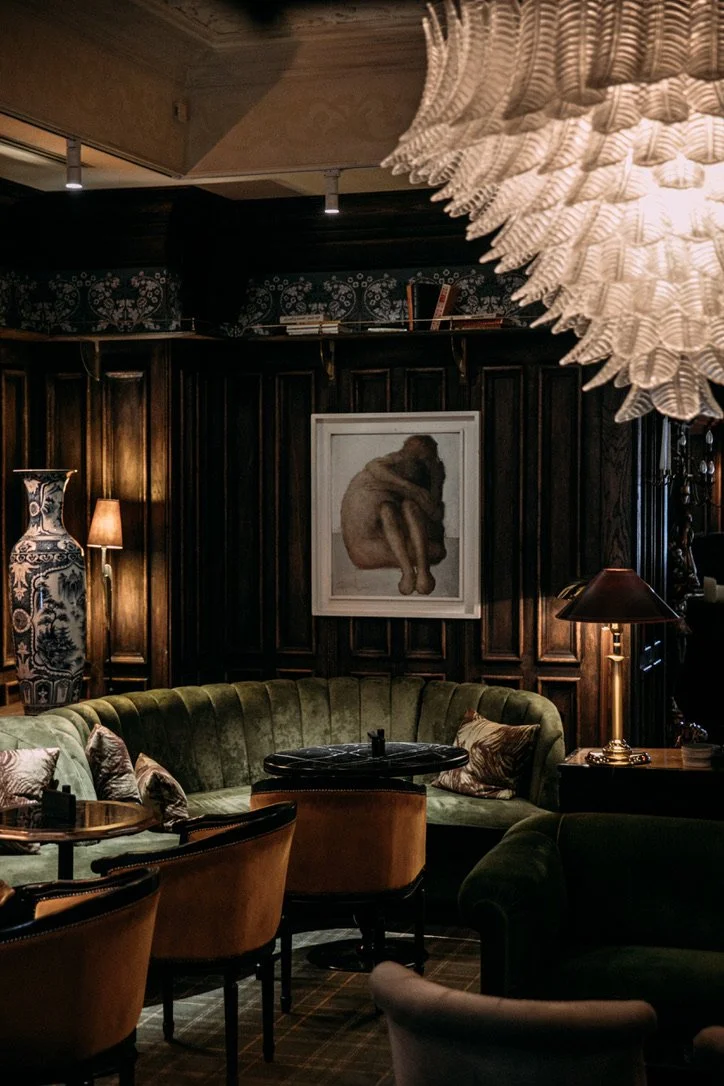 Interior design project by Belenko Design Studio (2022). Luxury bar, Kyiv, Ukraine. Services: concept, interior design, lighting design. Design features: dark wood paneling, decorative chandeliers, velvet seating, sophisticated lounge areas.