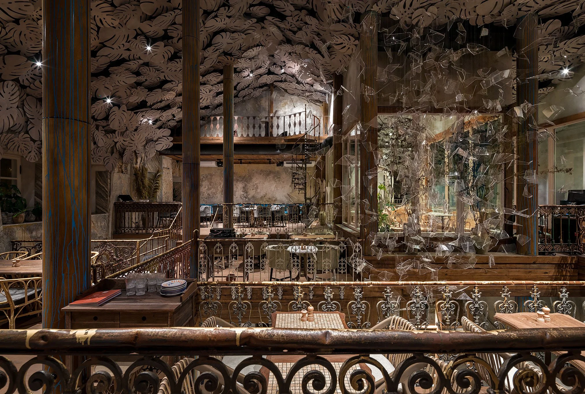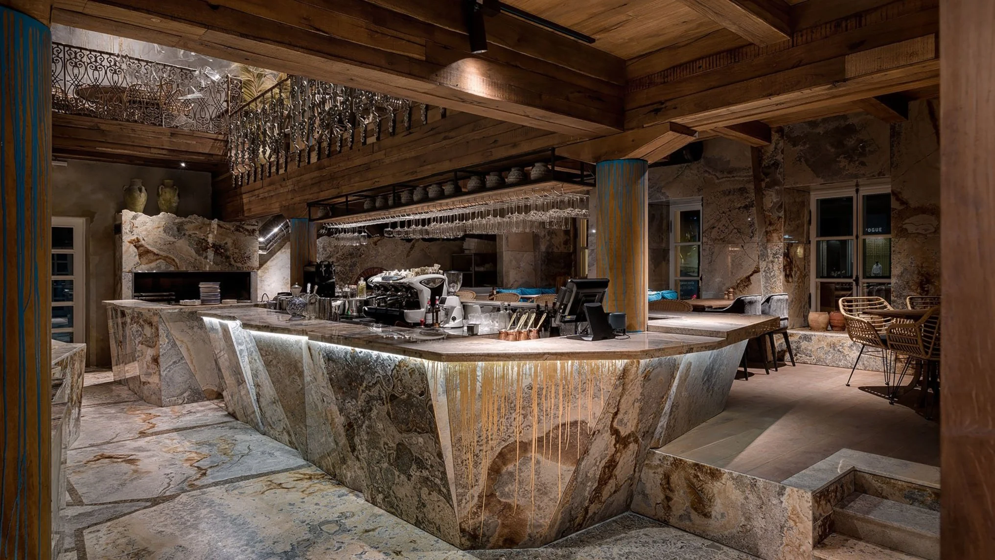Interior design project by Belenko Design Studio (2022). Greek restaurant, Odesa, Ukraine. Services: concept, interior design, architecture. Multi-level dining with marble counters, stone walls, ornate iron railings, tropical ceiling details.